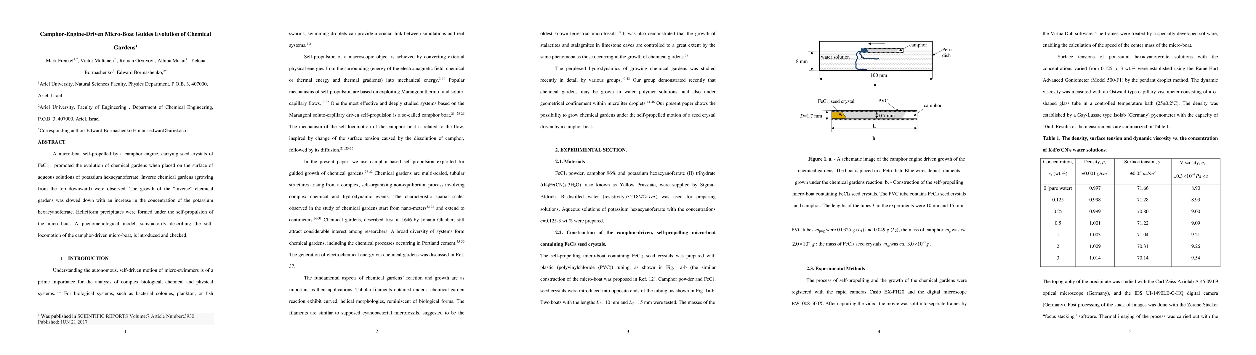 A micro-boat powered by a camphor engine creates inverse chemical gardens in potassium hexacyanoferrate solutions, demonstrating heliciform precipitate formation and self-propulsion. The model accurately describes the boat's motion and the garden growth rate decreases with higher hexacyanoferrate concentration.