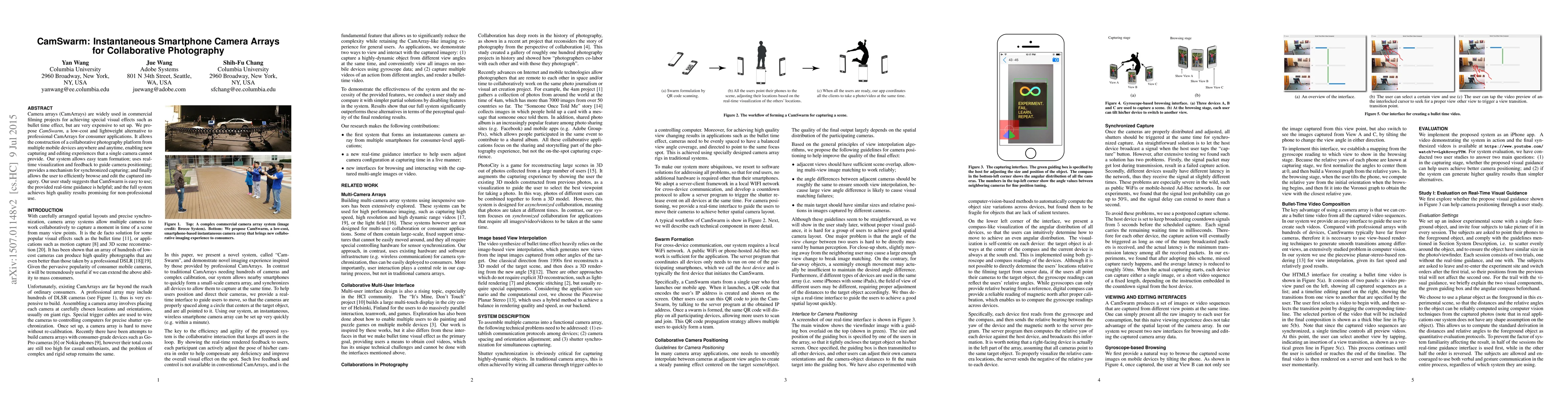 Camera arrays (CamArrays) are widely used in commercial filming projects for achieving special visual effects such as bullet time effect, but are very expensive to set up. We propose CamSwarm, a low-cost and lightweight alternative to professional CamArrays for consumer applications. It allows the construction of a collaborative photography platform from multiple mobile devices anywhere and anytime, enabling new capturing and editing experiences that a single camera cannot provide. Our system allows easy team formation; uses real-time visualization and feedback to guide camera positioning; provides a mechanism for synchronized capturing; and finally allows the user to efficiently browse and edit the captured imagery. Our user study suggests that CamSwarm is easy to use; the provided real-time guidance is helpful; and the full system achieves high quality results promising for non-professional use. A demo video is provided at https://www.youtube.com/watch?v=LgkHcvcyTTM.