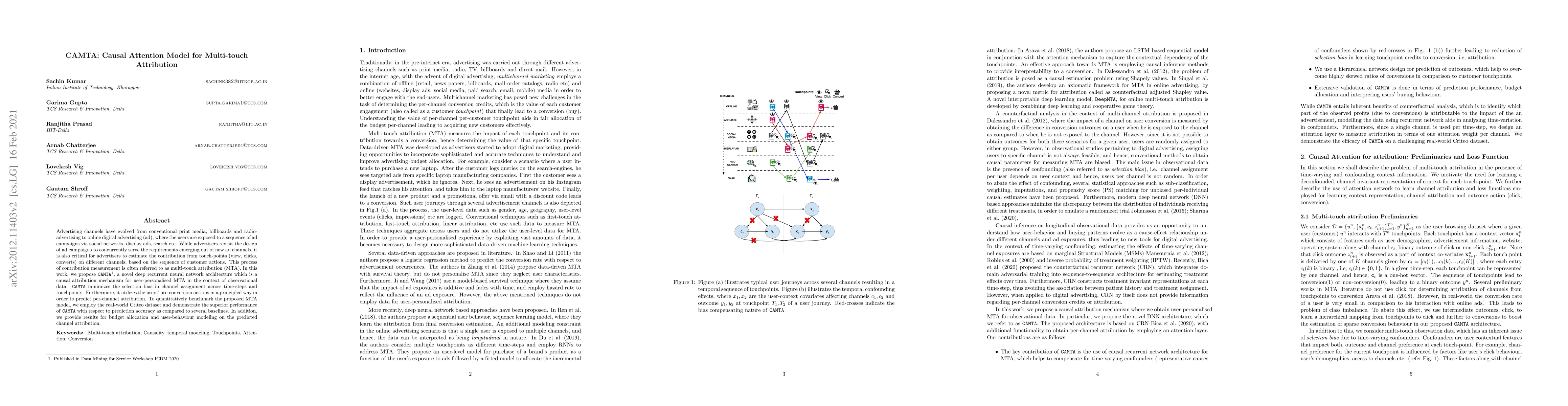 CAMTA is a novel deep recurrent neural network designed for personalized multi-touch attribution in digital advertising, minimizing selection bias and leveraging pre-conversion actions for improved prediction accuracy. Benchmarked on the Criteo dataset, CAMTA outperforms baselines in attribution prediction and aids in budget allocation and user-behaviour modeling.