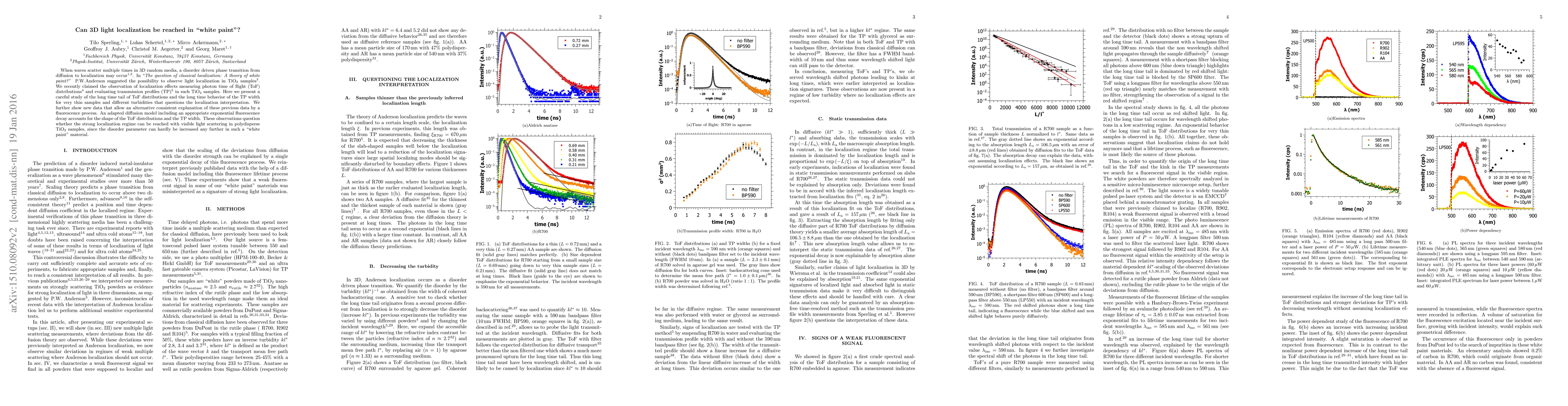 When waves scatter multiple times in 3D random media, a disorder driven phase transition from diffusion to localization may occur [Anderson 1958 Phys. Rev. 109 1492-505; Abrahams et al 1979 Phys. Rev. Lett. 42 673-6]. In "The question of classical localization: A theory of white paint?" P.W. Anderson suggested the possibility to observe light localization in TiO$_2$ samples [Anderson 1985 Phil. Mag. B 52 505-9]. We recently claimed the observation of localization effects measuring photon time of flight (ToF) distributions [St\"orzer et al 2006 Phys. Rev. Lett. 96 063904] and evaluating transmission profiles (TP) [Sperling et al 2013 Nat. Photonics 7 48-52] in such TiO$_2$ samples. Here we present a careful study of the long time tail of ToF distributions and the long time behavior of the TP width for very thin samples and different turbidities that questions the localization interpretation. We further show new data that allow an alternative consistent explanation of these previous data by a fluorescence process. An adapted diffusion model including an appropriate exponential fluorescence decay accounts for the shape of the ToF distributions and the TP width. These observations question whether the strong localization regime can be reached with visible light scattering in polydisperse TiO$_2$ samples, since the disorder parameter can hardly be increased any further in such a "white paint" material.