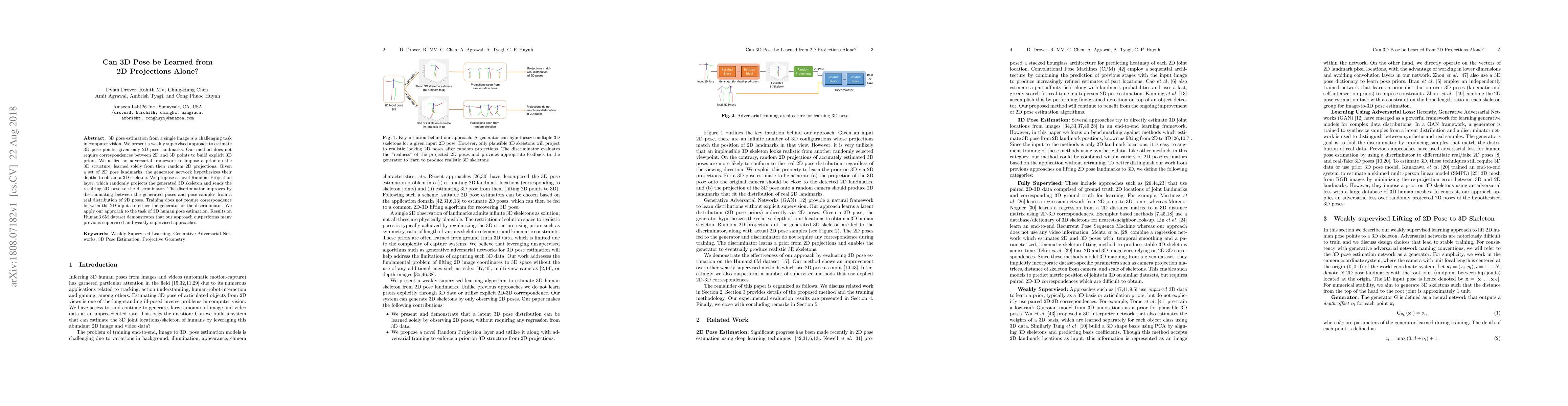 3D pose estimation from a single image is a challenging task in computer vision. We present a weakly supervised approach to estimate 3D pose points, given only 2D pose landmarks. Our method does not require correspondences between 2D and 3D points to build explicit 3D priors. We utilize an adversarial framework to impose a prior on the 3D structure, learned solely from their random 2D projections. Given a set of 2D pose landmarks, the generator network hypothesizes their depths to obtain a 3D skeleton. We propose a novel Random Projection layer, which randomly projects the generated 3D skeleton and sends the resulting 2D pose to the discriminator. The discriminator improves by discriminating between the generated poses and pose samples from a real distribution of 2D poses. Training does not require correspondence between the 2D inputs to either the generator or the discriminator. We apply our approach to the task of 3D human pose estimation. Results on Human3.6M dataset demonstrates that our approach outperforms many previous supervised and weakly supervised approaches.