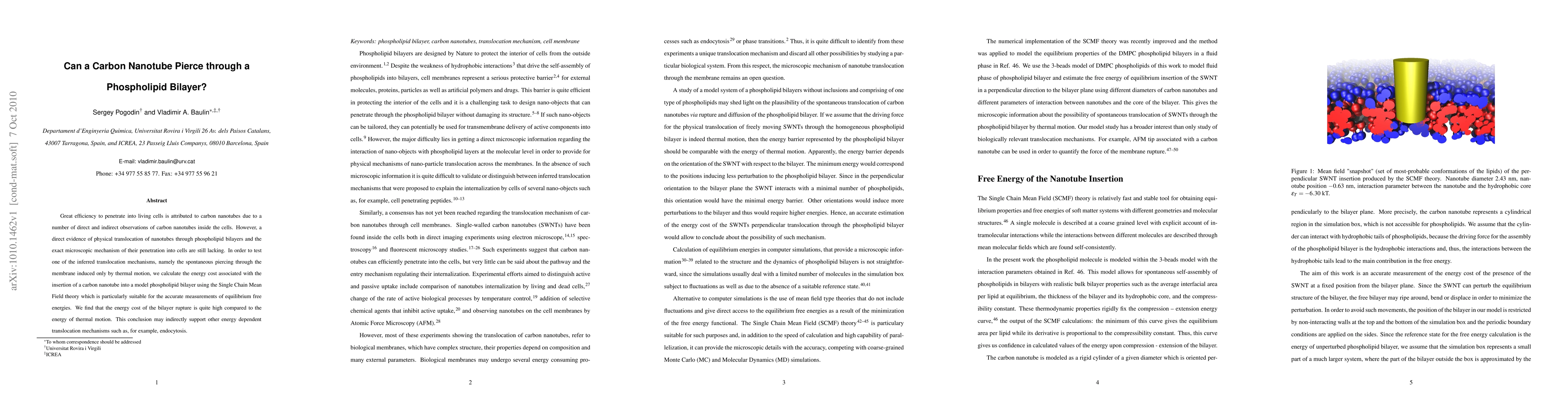 This study investigates whether carbon nanotubes can spontaneously pierce through phospholipid bilayers using computational methods. The results suggest that the energy cost for such a rupture is significantly higher than the thermal energy available, indicating that spontaneous piercing is unlikely and supporting alternative energy-dependent mechanisms like endocytosis for nanotube entry into cells.