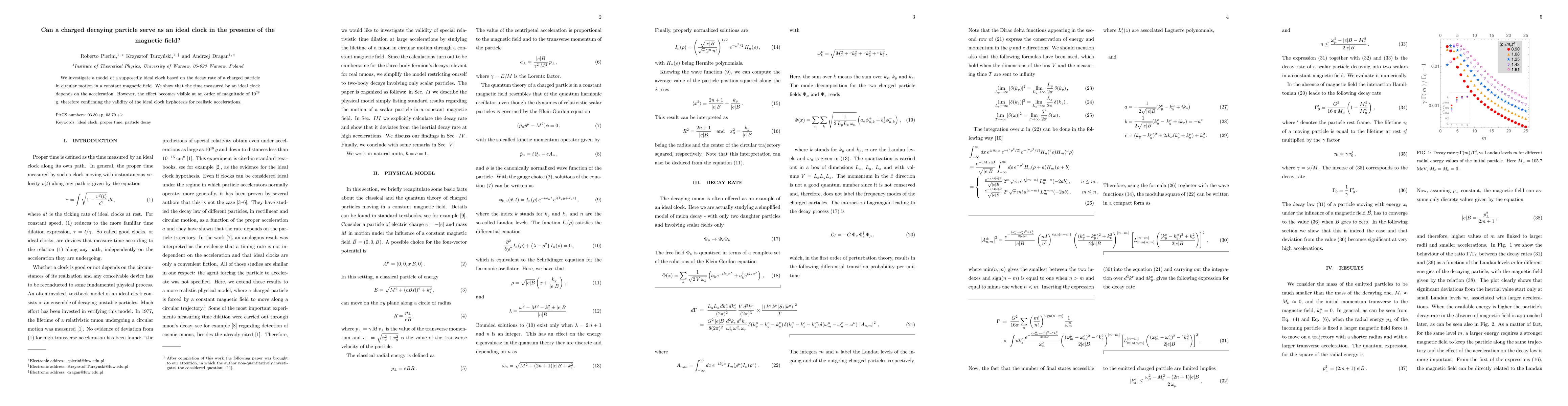 This research explores the concept of an ideal clock based on a charged particle's decay in a magnetic field, concluding that while acceleration does impact decay rate, the effect is negligible for realistic accelerations, validating the ideal clock hypothesis.