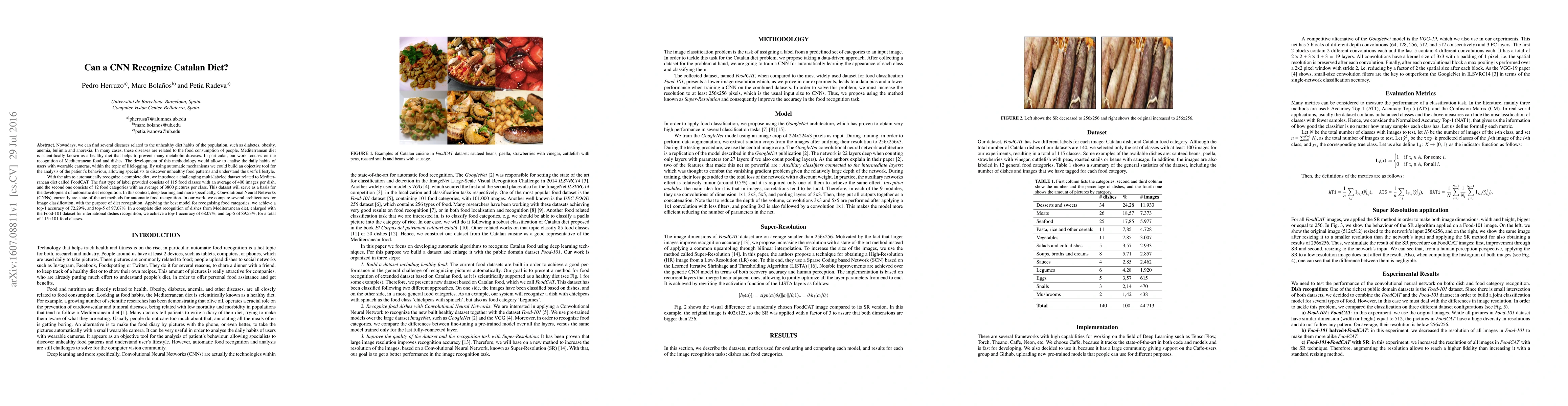 Nowadays, we can find several diseases related to the unhealthy diet habits of the population, such as diabetes, obesity, anemia, bulimia and anorexia. In many cases, these diseases are related to the food consumption of people. Mediterranean diet is scientifically known as a healthy diet that helps to prevent many metabolic diseases. In particular, our work focuses on the recognition of Mediterranean food and dishes. The development of this methodology would allow to analise the daily habits of users with wearable cameras, within the topic of lifelogging. By using automatic mechanisms we could build an objective tool for the analysis of the patient's behaviour, allowing specialists to discover unhealthy food patterns and understand the user's lifestyle. With the aim to automatically recognize a complete diet, we introduce a challenging multi-labeled dataset related to Mediterranean diet called FoodCAT. The first type of label provided consists of 115 food classes with an average of 400 images per dish, and the second one consists of 12 food categories with an average of 3800 pictures per class. This dataset will serve as a basis for the development of automatic diet recognition. In this context, deep learning and more specifically, Convolutional Neural Networks (CNNs), currently are state-of-the-art methods for automatic food recognition. In our work, we compare several architectures for image classification, with the purpose of diet recognition. Applying the best model for recognising food categories, we achieve a top-1 accuracy of 72.29\%, and top-5 of 97.07\%. In a complete diet recognition of dishes from Mediterranean diet, enlarged with the Food-101 dataset for international dishes recognition, we achieve a top-1 accuracy of 68.07\%, and top-5 of 89.53\%, for a total of 115+101 food classes.