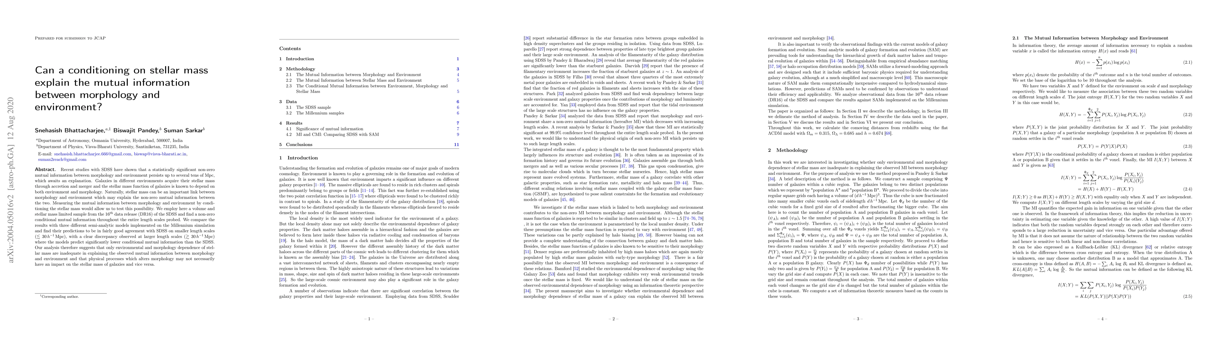 This study investigates whether stellar mass conditioning can explain the mutual information between galaxy morphology and environment, finding persistent non-zero conditional mutual information across various length scales. Comparisons with semi-analytic models show discrepancies at larger scales, suggesting that stellar mass alone is insufficient to explain the observed mutual information.