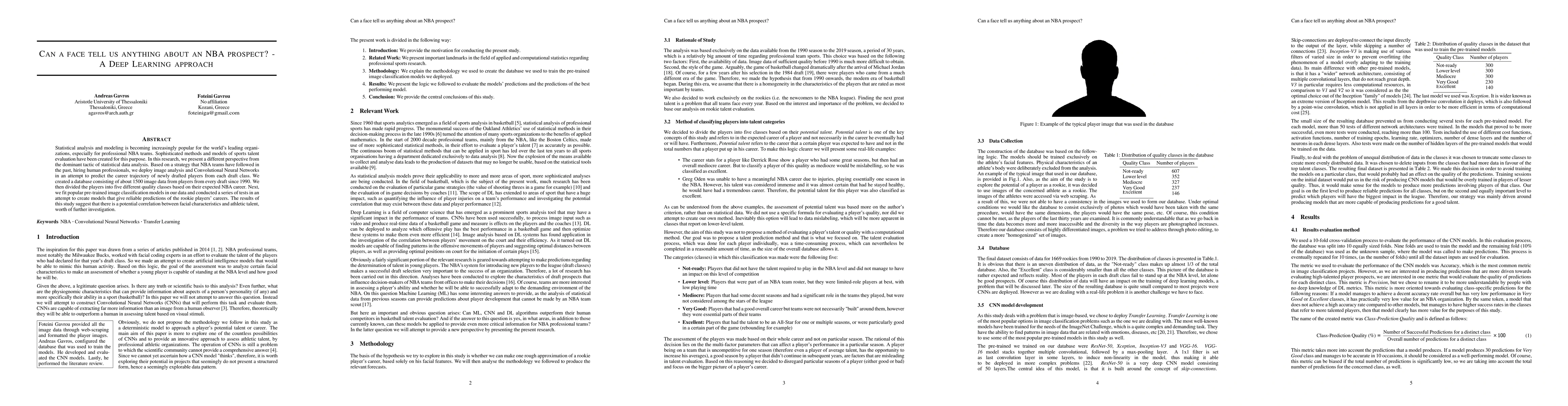 This research explores the use of deep learning and Convolutional Neural Networks to predict NBA player success based on facial images, finding a potential correlation between facial characteristics and athletic talent, suggesting further investigation is warranted.