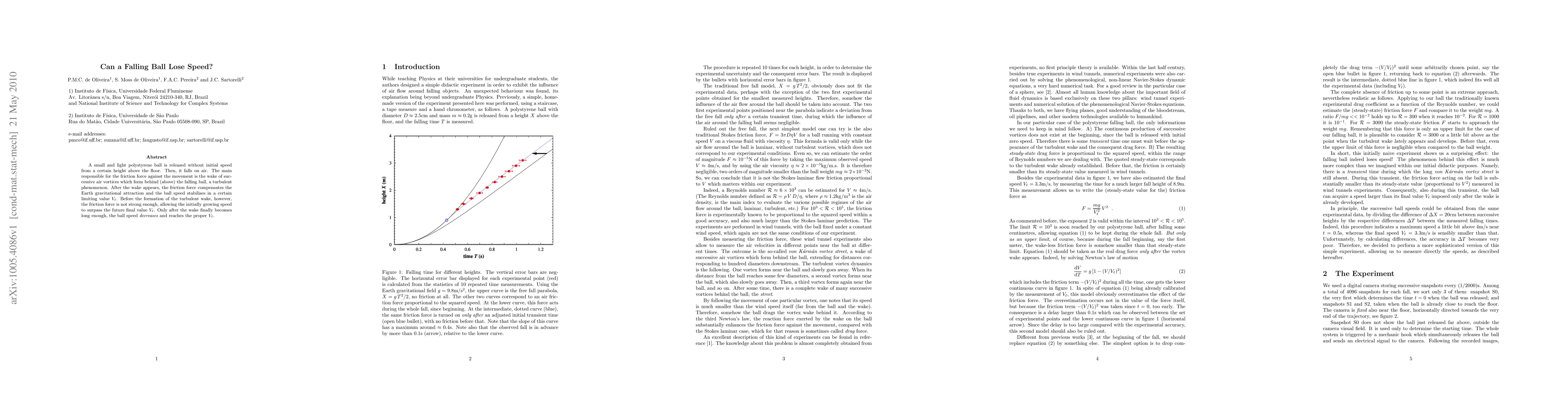 This study investigates the speed dynamics of a falling polystyrene ball, showing that it initially accelerates until a turbulent wake forms, after which friction stabilizes its speed at a limiting value, Vl. The ball's speed only decreases to Vl once the wake sufficiently develops.