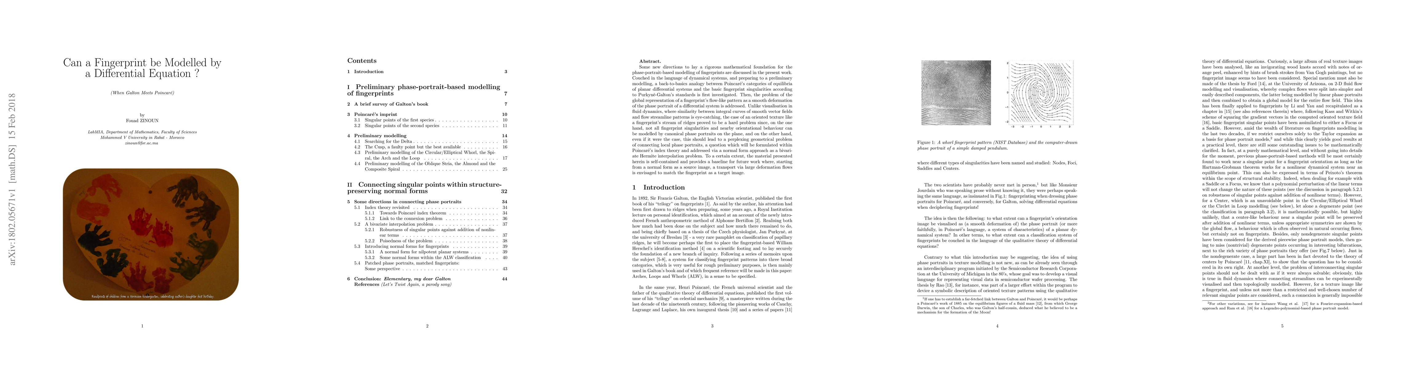 Some new directions to lay a rigorous mathematical foundation for the phase-portrait-based modelling of fingerprints are discussed in the present work. Couched in the language of dynamical systems, and preparing to a preliminary modelling, a back-to-basics analogy between Poincar\'{e}'s categories of equilibria of planar differential systems and the basic fingerprint singularities according to Purkyn\v{e}-Galton's standards is first investigated. Then, the problem of the global representation of a fingerprint's flow-like pattern as a smooth deformation of the phase portrait of a differential system is addressed. Unlike visualisation in fluid dynamics, where similarity between integral curves of smooth vector fields and flow streamline patterns is eye-catching, the case of an oriented texture like a fingerprint's stream of ridges proved to be a hard problem since, on the one hand, not all fingerprint singularities and nearby orientational behaviour can be modelled by canonical phase portraits on the plane, and on the other hand, even if it were the case, this should lead to a perplexing geometrical problem of connecting local phase portraits, a question which will be formulated within Poincar\'{e}'s index theory and addressed via a normal form approach as a bivariate Hermite interpolation problem. To a certain extent, the material presented herein is self-contained and provides a baseline for future work where, starting from a normal form as a source image, a transport via large deformation flows is envisaged to match the fingerprint as a target image.