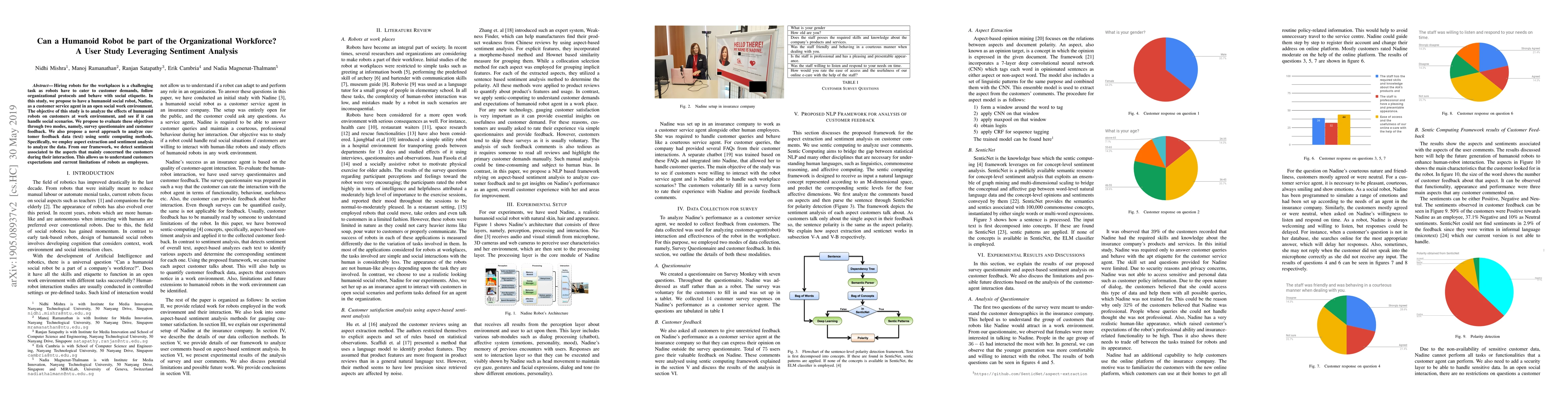 Hiring robots for the workplaces is a challenging task as robots have to cater to customer demands, follow organizational protocols and behave with social etiquette. In this study, we propose to have a humanoid social robot, Nadine, as a customer service agent in an open social work environment. The objective of this study is to analyze the effects of humanoid robots on customers at work environment, and see if it can handle social scenarios. We propose to evaluate these objectives through two modes, namely, survey questionnaire and customer feedback. We also propose a novel approach to analyze customer feedback data (text) using sentic computing methods. Specifically, we employ aspect extraction and sentiment analysis to analyze the data. From our framework, we detect sentiment associated to the aspects that mainly concerned the customers during their interaction. This allows us to understand customers expectations and current limitations of robots as employees.