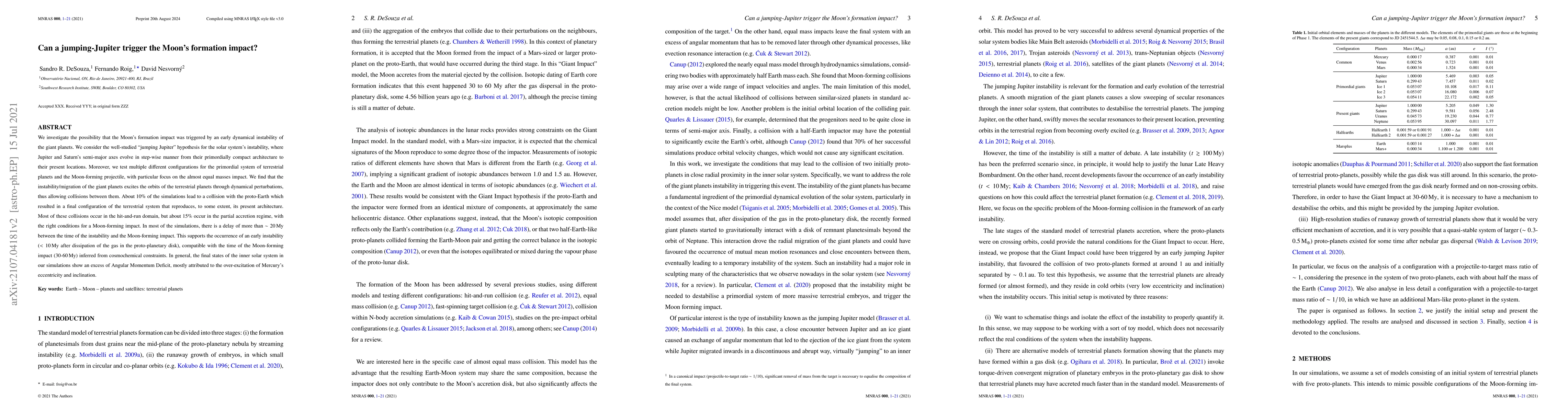 This paper explores if a "jumping Jupiter" scenario could trigger the Moon's formation via a collision between the proto-Earth and a Moon-forming projectile, finding that such planetary migrations can excite terrestrial planet orbits, leading to about 15% of collisions in the partial accretion regime suitable for a Moon-forming impact. The study supports an early solar system instability occurring within 10 My after gas dissipation, aligning with the Moon's formation timeline.