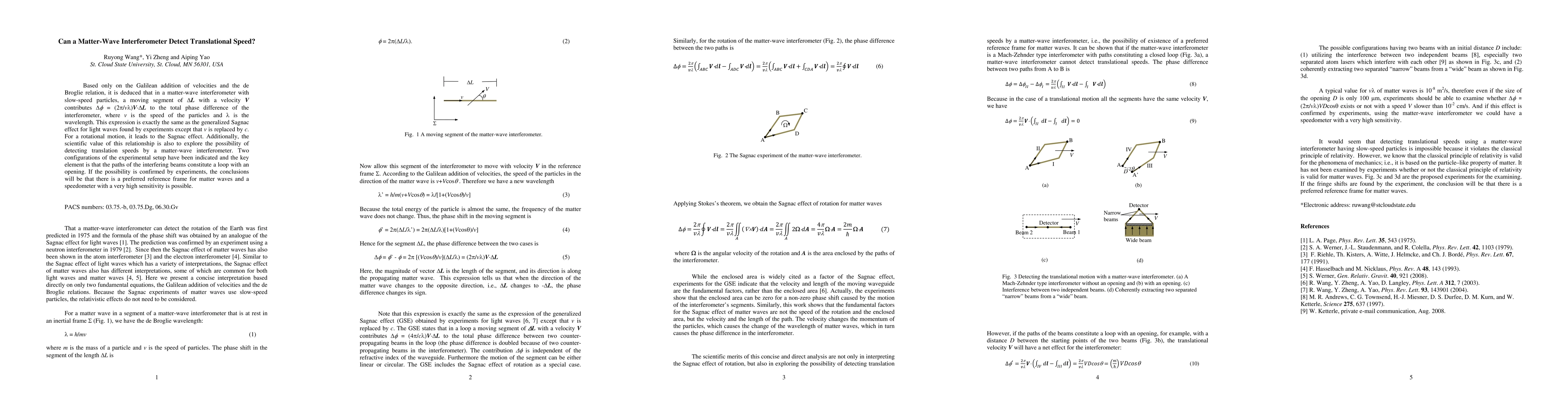 This paper explores the potential of a matter-wave interferometer to detect translational speed using the Galilean addition of velocities and the de Broglie relation. It proposes that a moving segment contributes to the phase difference in the interferometer, similar to the generalized Sagnac effect for light waves, suggesting a high-sensitivity speedometer could be possible.