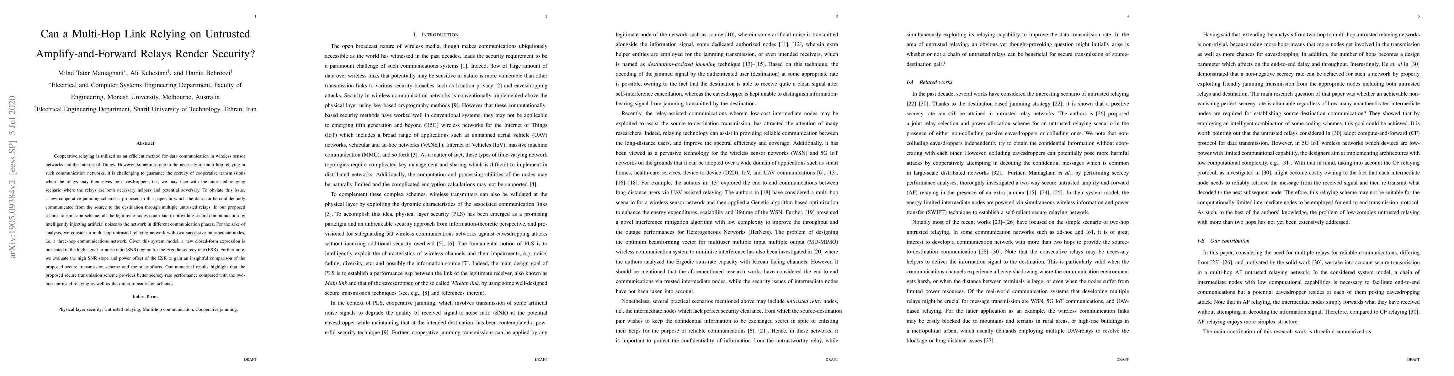 This paper proposes a cooperative jamming scheme for secure multi-hop communication in wireless sensor networks and IoT, where untrusted relays may act as eavesdroppers. The scheme uses artificial noise injection by legitimate nodes to enhance secrecy, and a new closed-form expression for Ergodic secrecy rate is developed, showing improved performance over existing methods.