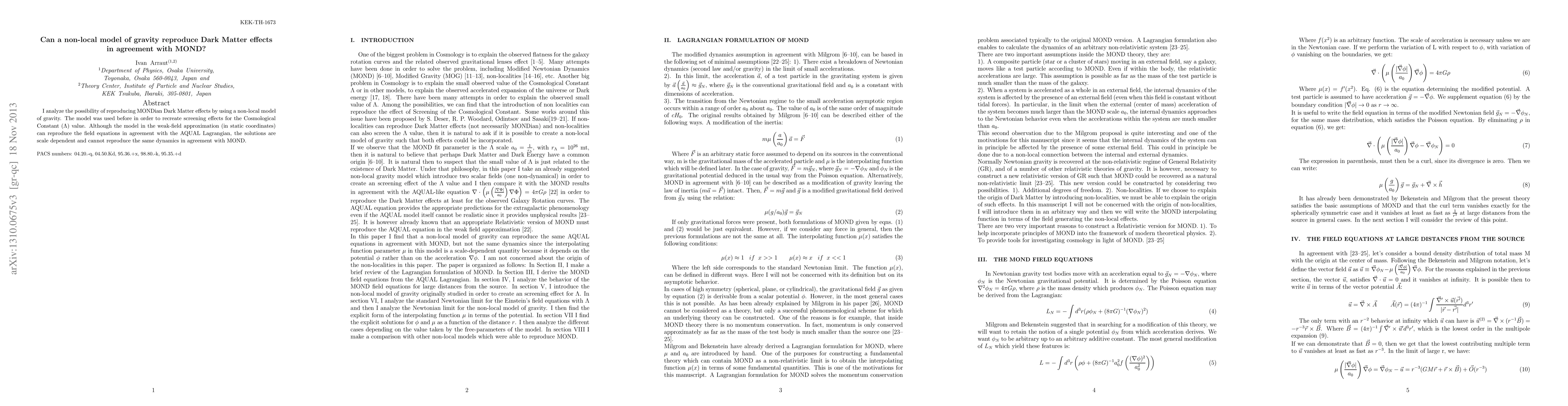 Researchers investigated whether a non-local model of gravity can reproduce Dark Matter effects in agreement with MOND (Modified Newtonian Dynamics), but found that the solutions were scale-dependent and failed to match the dynamics of MOND.