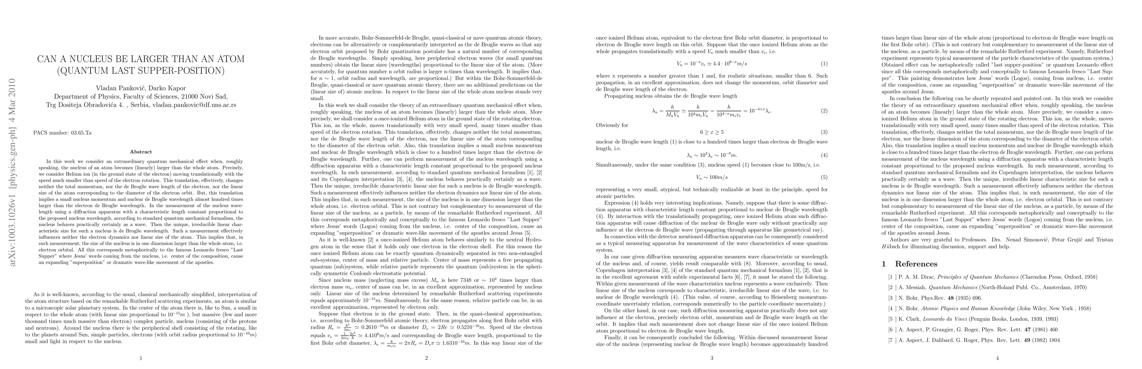 In this work we consider an extraordinary quantum mechanical effect when, roughly speaking, the nucleus of an atom becomes (linearly) larger than the whole atom. Precisely, we consider Helium ion (in the ground state of the electron) moving translationally with the speed much smaller than speed of the electron rotation. This translation, effectively, changes neither the total momentum, nor the de Broglie wave length of the electron, nor the linear size of the atom corresponding to the diameter of the electron orbit. But, this translation implies a small nucleus momentum and nuclear de Broglie wavelength almost hundred times larger than the electron de Broglie wavelength. In the measurement of the nucleus wavelength using a diffraction apparatus with a characteristic length constant proportional to the proposed nucleus wavelength, according to standard quantum mechanical formalism, the nucleus behaves practically certainly as a wave. Then the unique, irreducible linear characteristic size for such a nucleus is de Broglie wavelength. Such a measurement effectively influences neither the electron dynamics nor linear size of the atom. This implies that, in such measurement, the size of the nucleus is in one dimension larger than the whole atom, i.e. electron orbital. All this corresponds metaphorically to the famous Leonardo fresco "Last Supper" where Jesus' words coming from the nucleus, i.e. center of the composition, cause an expanding "superposition" or dramatic wave-like movement of the apostles.