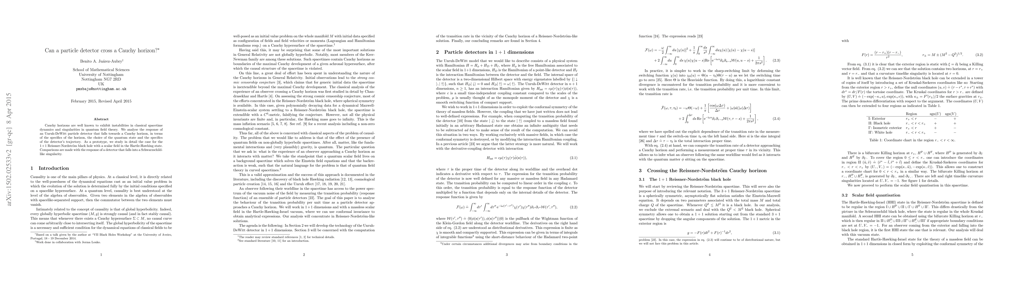 This paper investigates the response of a particle detector as it approaches a Cauchy horizon, examining the effects of the horizon's nature, the detector's quantum state, and its trajectory. It focuses on the $1+1$ Reissner-Nordström black hole and compares the detector's behavior near a Cauchy horizon to its response near a Schwarzschild-like singularity.