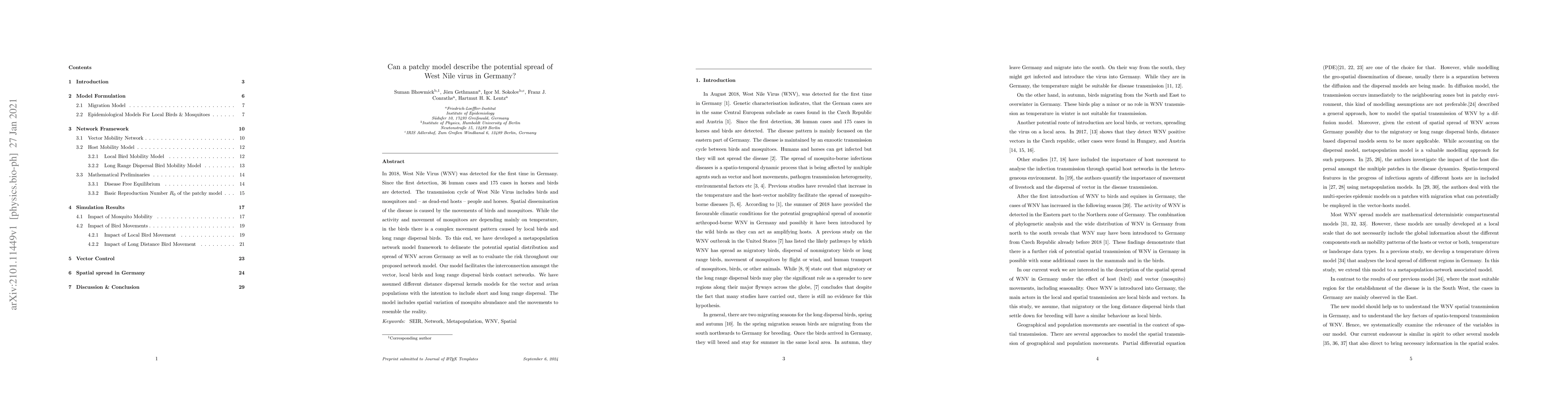 This study develops a metapopulation network model to assess the potential spread of West Nile Virus in Germany, considering the roles of birds and mosquitoes in the transmission cycle. The model evaluates spatial distribution and risk, incorporating different dispersal kernels for vectors and avian populations to reflect short and long-range movements.
