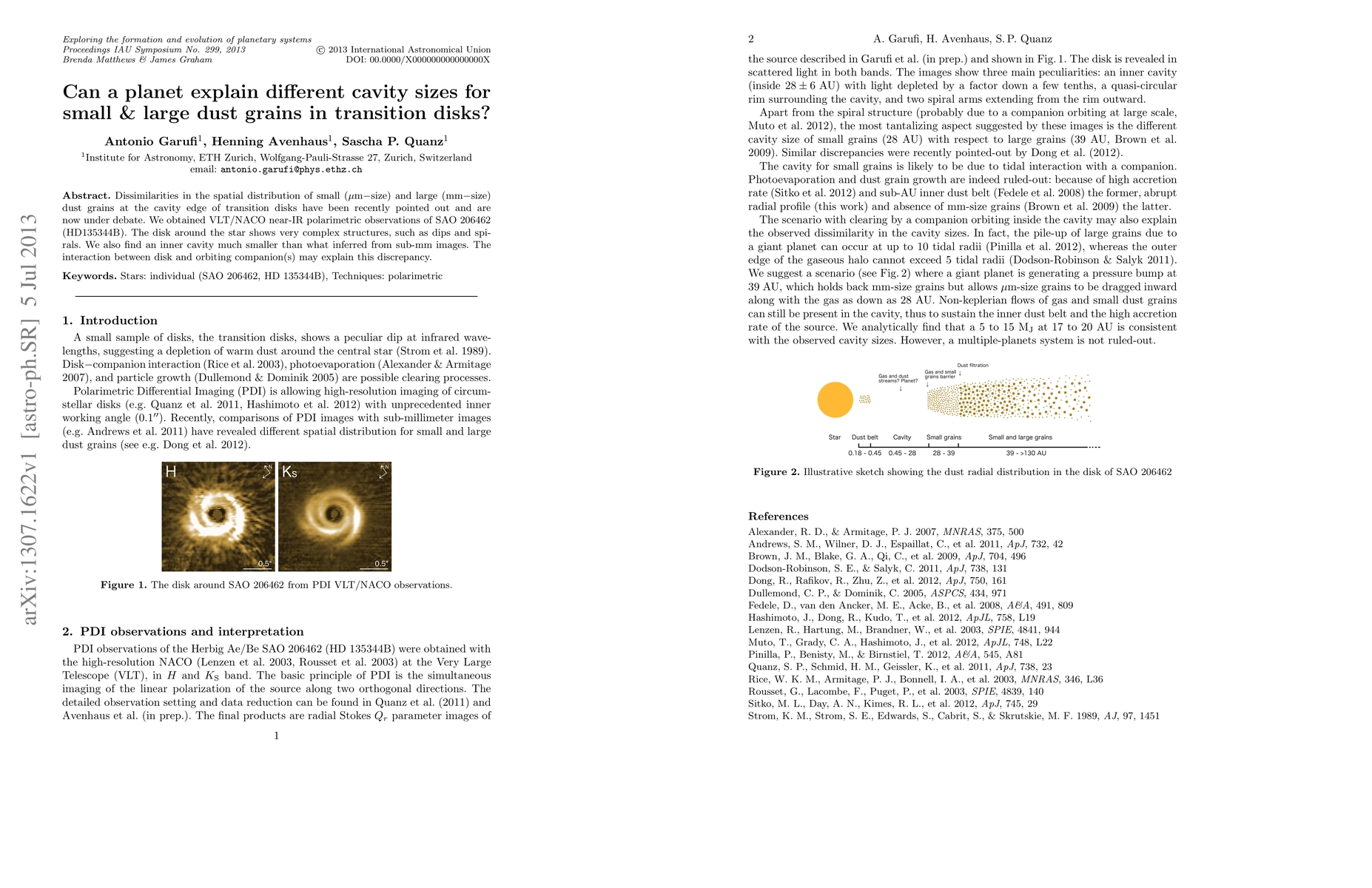 This paper investigates the differing cavity sizes for small and large dust grains in transition disks, using observations of SAO 206462. The findings suggest that the interaction between the disk and orbiting companions could explain the observed discrepancies in cavity sizes.