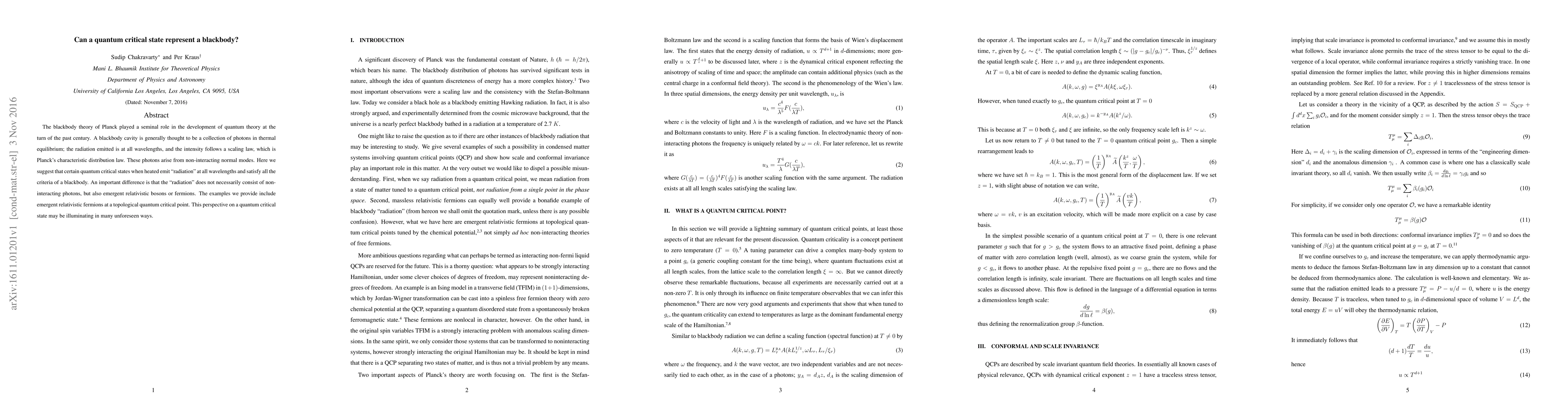 The blackbody theory of Planck played a seminal role in the development of quantum theory at the turn of the past century. A blackbody cavity is generally thought to be a collection of photons in thermal equilibrium; the radiation emitted is at all wavelengths, and the intensity follows a scaling law, which is Planck's characteristic distribution law. These photons arise from non-interacting normal modes. Here we suggest that certain quantum critical states when heated emit "radiation" at all wavelengths and satisfy all the criteria of a blackbody. An important difference is that the "radiation" does not necessarily consist of non-interacting photons, but also emergent relativistic bosons or fermions. The examples we provide include emergent relativistic fermions at a topological quantum critical point. This perspective on a quantum critical state may be illuminating in many unforeseen ways.