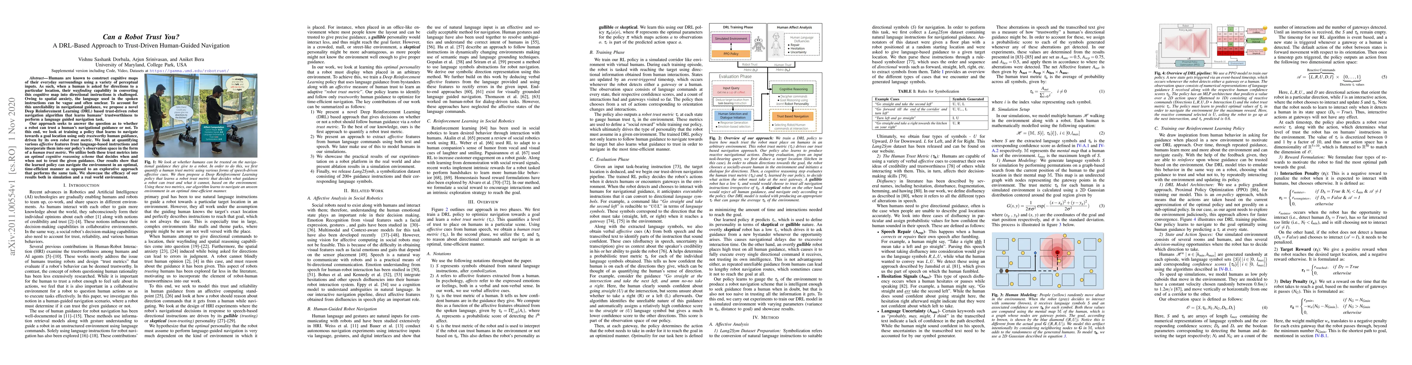 Humans are known to construct cognitive maps of their everyday surroundings using a variety of perceptual inputs. As such, when a human is asked for directions to a particular location, their wayfinding capability in converting this cognitive map into directional instructions is challenged. Owing to spatial anxiety, the language used in the spoken instructions can be vague and often unclear. To account for this unreliability in navigational guidance, we propose a novel Deep Reinforcement Learning (DRL) based trust-driven robot navigation algorithm that learns humans' trustworthiness to perform a language guided navigation task. Our approach seeks to answer the question as to whether a robot can trust a human's navigational guidance or not. To this end, we look at training a policy that learns to navigate towards a goal location using only trustworthy human guidance, driven by its own robot trust metric. We look at quantifying various affective features from language-based instructions and incorporate them into our policy's observation space in the form of a human trust metric. We utilize both these trust metrics into an optimal cognitive reasoning scheme that decides when and when not to trust the given guidance. Our results show that the learned policy can navigate the environment in an optimal, time-efficient manner as opposed to an explorative approach that performs the same task. We showcase the efficacy of our results both in simulation and a real-world environment.