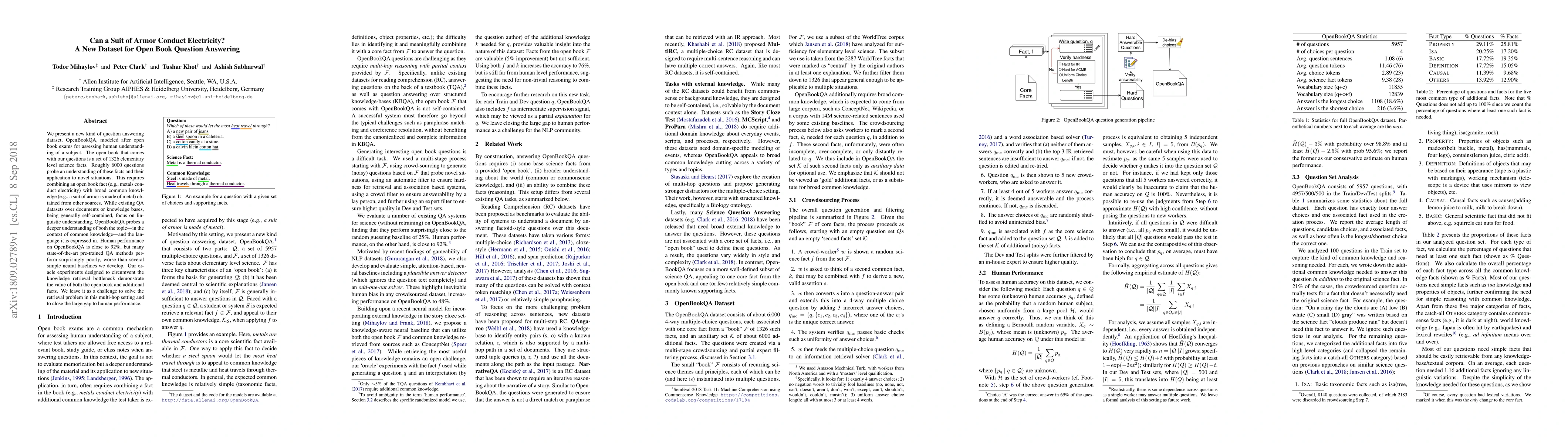 This paper introduces OpenBookQA, a novel question answering dataset requiring integration of elementary science facts with common knowledge, such as determining if a suit of armor conducts electricity. Despite human performance being close to 92%, current QA models lag behind, highlighting the need for improved knowledge retrieval and multi-hop reasoning.