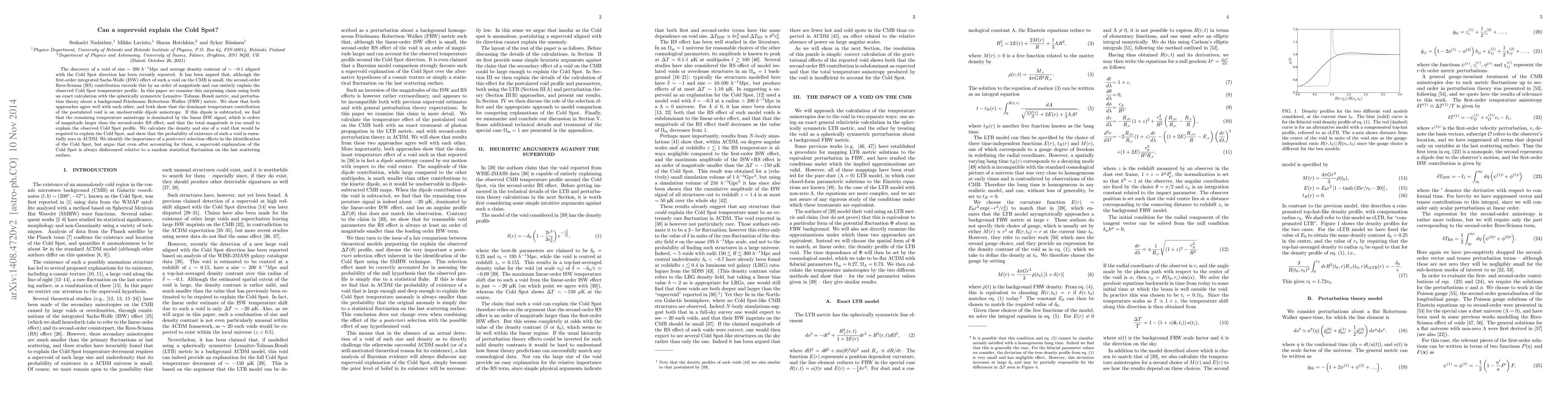 This paper investigates whether a supervoid can explain the Cold Spot in the Cosmic Microwave Background (CMB). Despite claims that a second-order Rees-Sciama effect could account for the Cold Spot, the study finds that the linear integrated Sachs-Wolfe effect is much larger and that the required supervoid is highly improbable in the standard cosmological model.