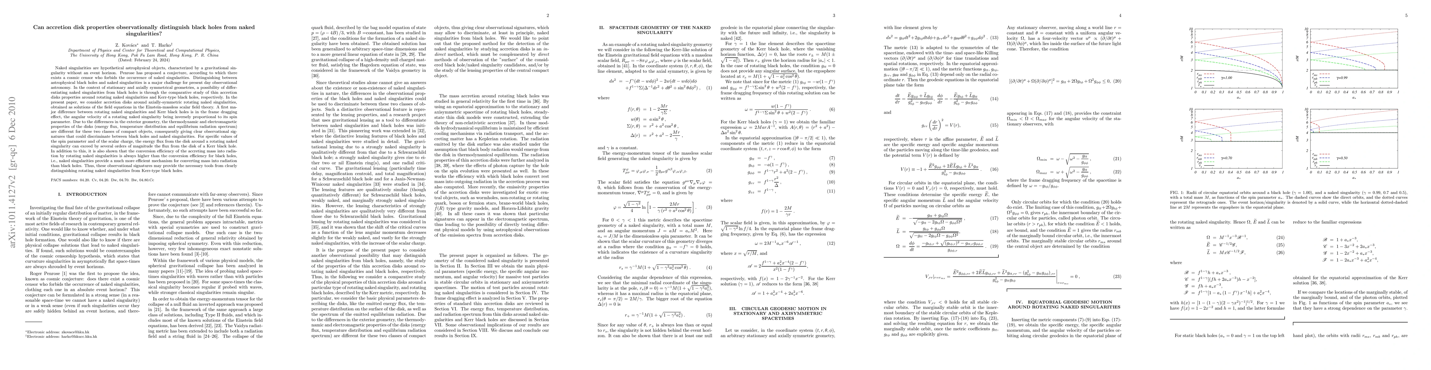 This paper explores whether accretion disk properties can distinguish black holes from naked singularities, proposing that differences in frame dragging and thermodynamic/electromagnetic properties of accretion disks around rotating naked singularities and Kerr black holes could provide clear observational signatures. The study finds that energy flux and conversion efficiency of accreting mass into radiation are significantly higher for naked singularities, offering potential tools for discrimination.