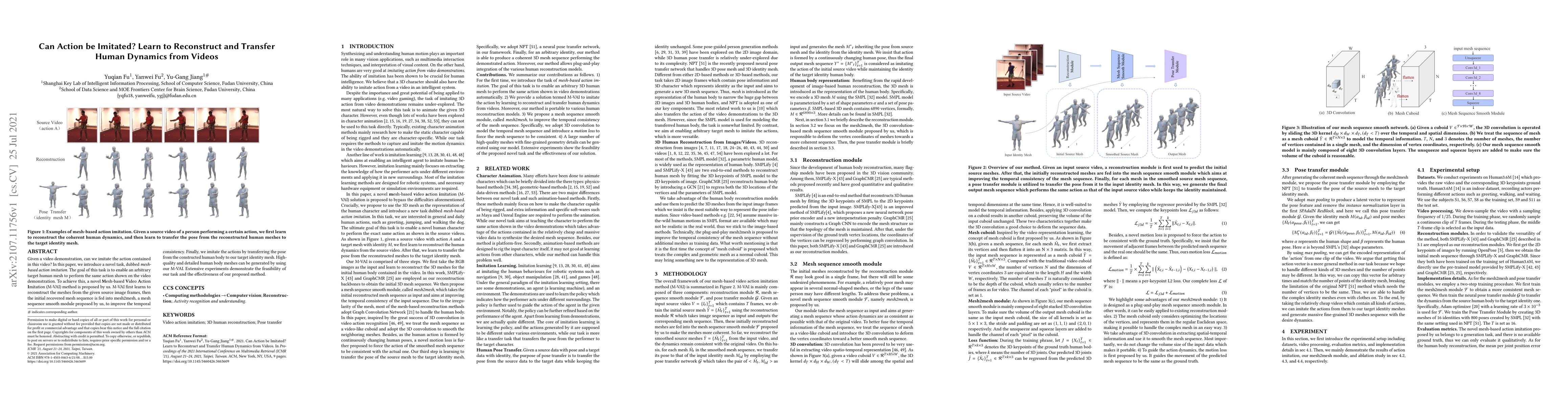 This paper proposes a novel Mesh-based Video Action Imitation (M-VAI) method to reconstruct and transfer human dynamics from video demonstrations to arbitrary target human meshes, achieving high-quality and temporally consistent mesh sequences. Extensive experiments validate the feasibility and effectiveness of the proposed approach.