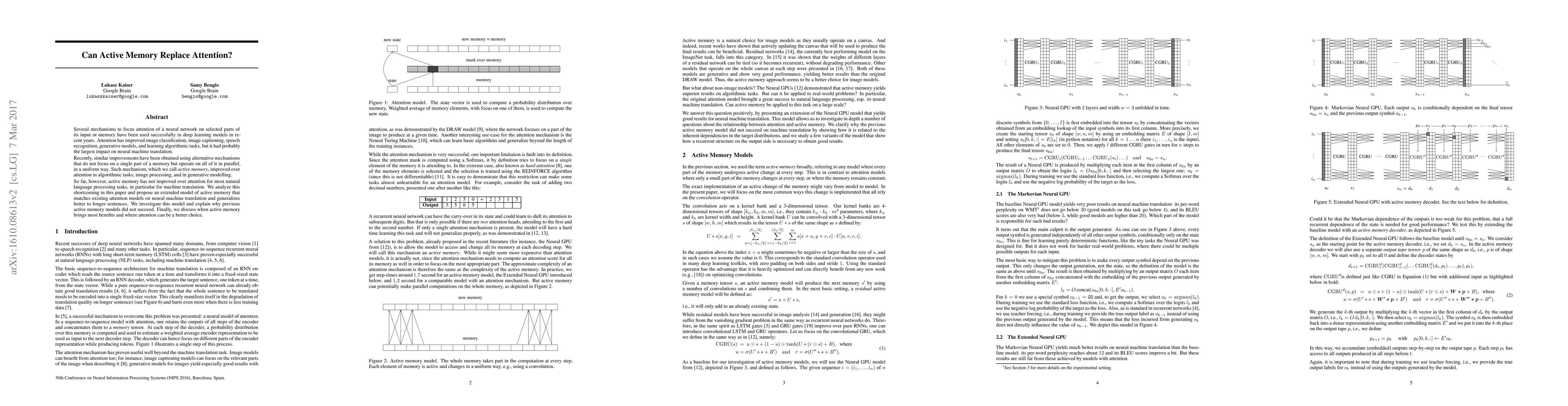 Several mechanisms to focus attention of a neural network on selected parts of its input or memory have been used successfully in deep learning models in recent years. Attention has improved image classification, image captioning, speech recognition, generative models, and learning algorithmic tasks, but it had probably the largest impact on neural machine translation. Recently, similar improvements have been obtained using alternative mechanisms that do not focus on a single part of a memory but operate on all of it in parallel, in a uniform way. Such mechanism, which we call active memory, improved over attention in algorithmic tasks, image processing, and in generative modelling. So far, however, active memory has not improved over attention for most natural language processing tasks, in particular for machine translation. We analyze this shortcoming in this paper and propose an extended model of active memory that matches existing attention models on neural machine translation and generalizes better to longer sentences. We investigate this model and explain why previous active memory models did not succeed. Finally, we discuss when active memory brings most benefits and where attention can be a better choice.