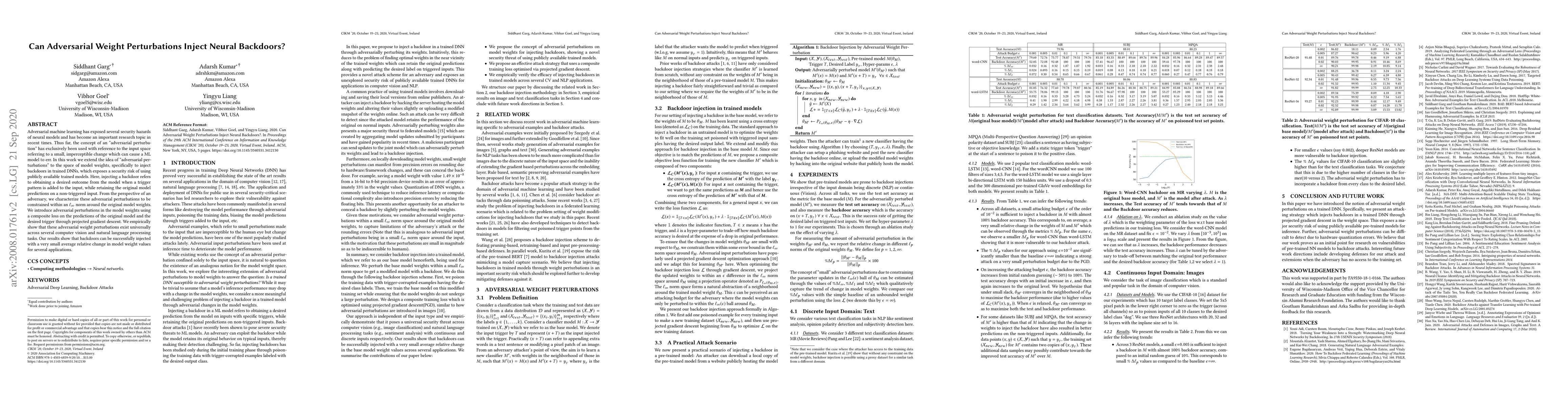 Researchers found that adversarial weight perturbations can be used to inject backdoors into trained neural networks, exposing a security risk with publicly available models. These perturbations allow for the creation of 'trigger' patterns that induce desired outcomes in the model.
