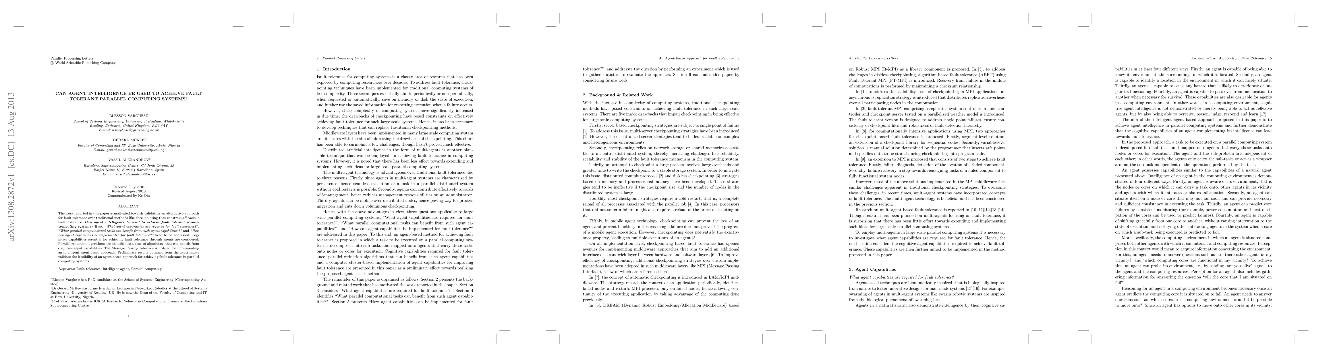 This paper explores whether agent intelligence can provide an alternative to traditional fault tolerance methods in parallel computing systems. Preliminary results suggest that cognitive agents can enhance fault tolerance, particularly for parallel reduction algorithms, using the Message Passing Interface for implementation.