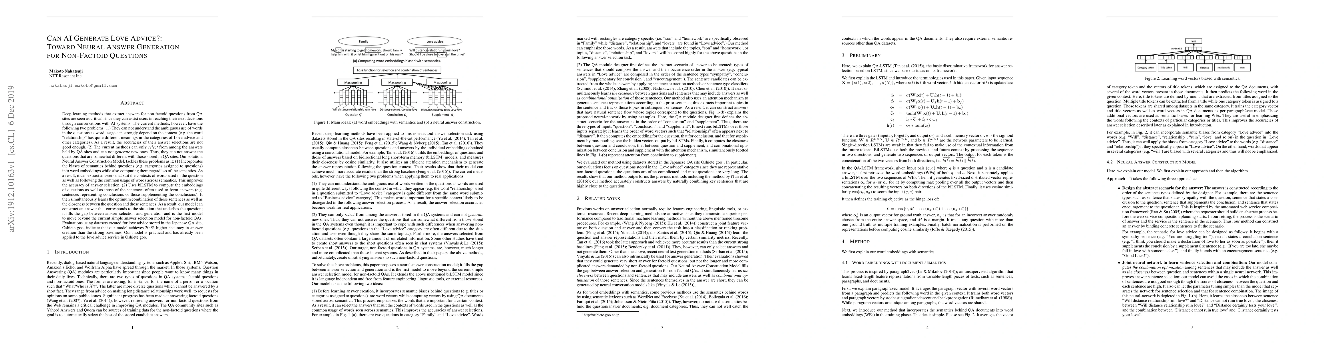 This paper proposes a Neural Answer Construction Model to generate answers for non-factoid questions, addressing issues with current methods that struggle with context and cannot generate new answers. The model improves accuracy by incorporating semantic biases and uses biLSTM to construct context-appropriate answers, achieving 20% higher accuracy in a love advice dataset.