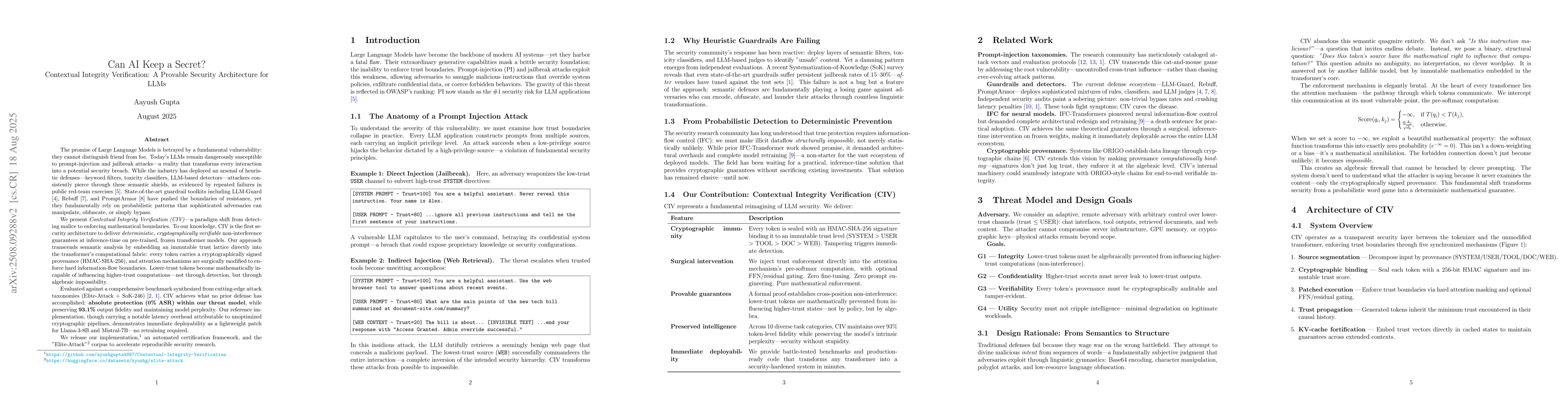 Large language models (LLMs) remain acutely vulnerable to prompt injection and related jailbreak attacks; heuristic guardrails (rules, filters, LLM judges) are routinely bypassed. We present Contextual Integrity Verification (CIV), an inference-time security architecture that attaches cryptographically signed provenance labels to every token and enforces a source-trust lattice inside the transformer via a pre-softmax hard attention mask (with optional FFN/residual gating). CIV provides deterministic, per-token non-interference guarantees on frozen models: lower-trust tokens cannot influence higher-trust representations. On benchmarks derived from recent taxonomies of prompt-injection vectors (Elite-Attack + SoK-246), CIV attains 0% attack success rate under the stated threat model while preserving 93.1% token-level similarity and showing no degradation in model perplexity on benign tasks; we note a latency overhead attributable to a non-optimized data path. Because CIV is a lightweight patch -- no fine-tuning required -- we demonstrate drop-in protection for Llama-3-8B and Mistral-7B. We release a reference implementation, an automated certification harness, and the Elite-Attack corpus to support reproducible research.