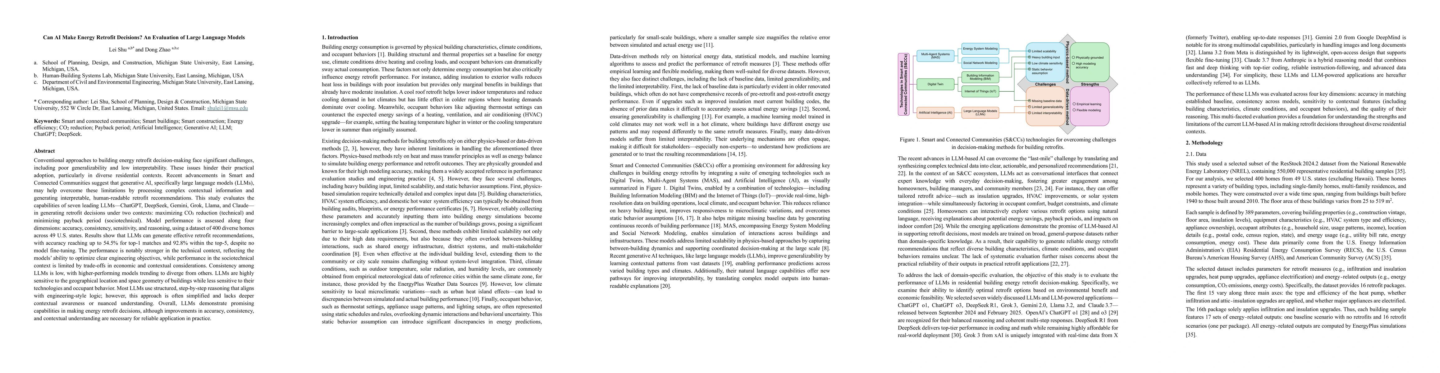 Conventional approaches to building energy retrofit decision making suffer from limited generalizability and low interpretability, hindering adoption in diverse residential contexts. With the growth of Smart and Connected Communities, generative AI, especially large language models (LLMs), may help by processing contextual information and producing practitioner readable recommendations. We evaluate seven LLMs (ChatGPT, DeepSeek, Gemini, Grok, Llama, and Claude) on residential retrofit decisions under two objectives: maximizing CO2 reduction (technical) and minimizing payback period (sociotechnical). Performance is assessed on four dimensions: accuracy, consistency, sensitivity, and reasoning, using a dataset of 400 homes across 49 US states. LLMs generate effective recommendations in many cases, reaching up to 54.5 percent top 1 match and 92.8 percent within top 5 without fine tuning. Performance is stronger for the technical objective, while sociotechnical decisions are limited by economic trade offs and local context. Agreement across models is low, and higher performing models tend to diverge from others. LLMs are sensitive to location and building geometry but less sensitive to technology and occupant behavior. Most models show step by step, engineering style reasoning, but it is often simplified and lacks deeper contextual awareness. Overall, LLMs are promising assistants for energy retrofit decision making, but improvements in accuracy, consistency, and context handling are needed for reliable practice.