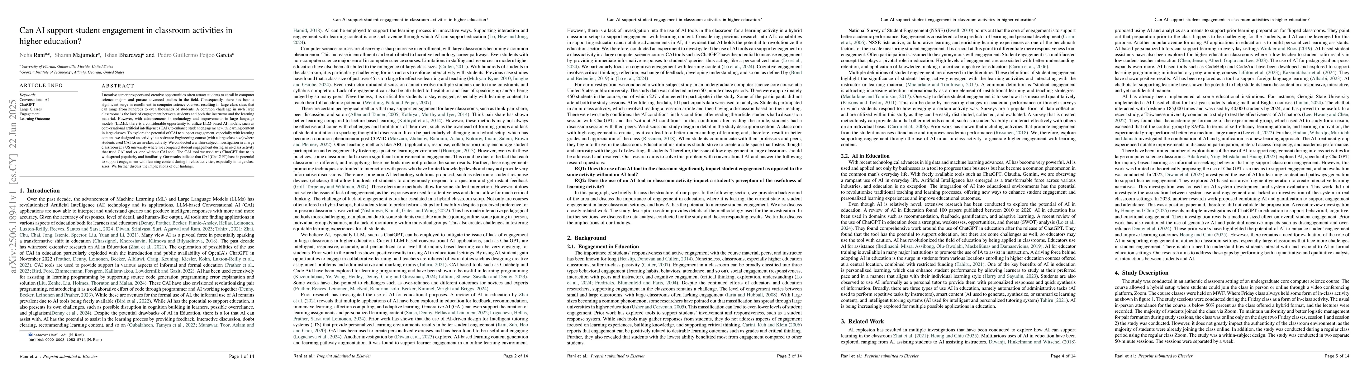 Lucrative career prospects and creative opportunities often attract students to enroll in computer science majors and pursue advanced studies in the field. Consequently, there has been a significant surge in enrollment in computer science courses, resulting in large class sizes that can range from hundreds to even thousands of students. A common challenge in such large classrooms is the lack of engagement between students and both the instructor and the learning material. However, with advancements in technology and improvements in large language models (LLMs), there is a considerable opportunity to utilize LLM-based AI models, such as conversational artificial intelligence (CAI), to enhance student engagement with learning content in large classes. To explore the potential of CAI to support engagement, especially with learning content, we designed an activity in a software Engineering course (with a large class size) where students used CAI for an in-class activity. We conducted a within-subject investigation in a large classroom at a US university where we compared student engagement during an in-class activity that used CAI tool vs. one without CAI tool. The CAI tool we used was ChatGPT due to its widespread popularity and familiarity. Our results indicate that CAI (ChatGPT) has the potential to support engagement with learning content during in-class activities, especially in large class sizes. We further discuss the implications of our findings.