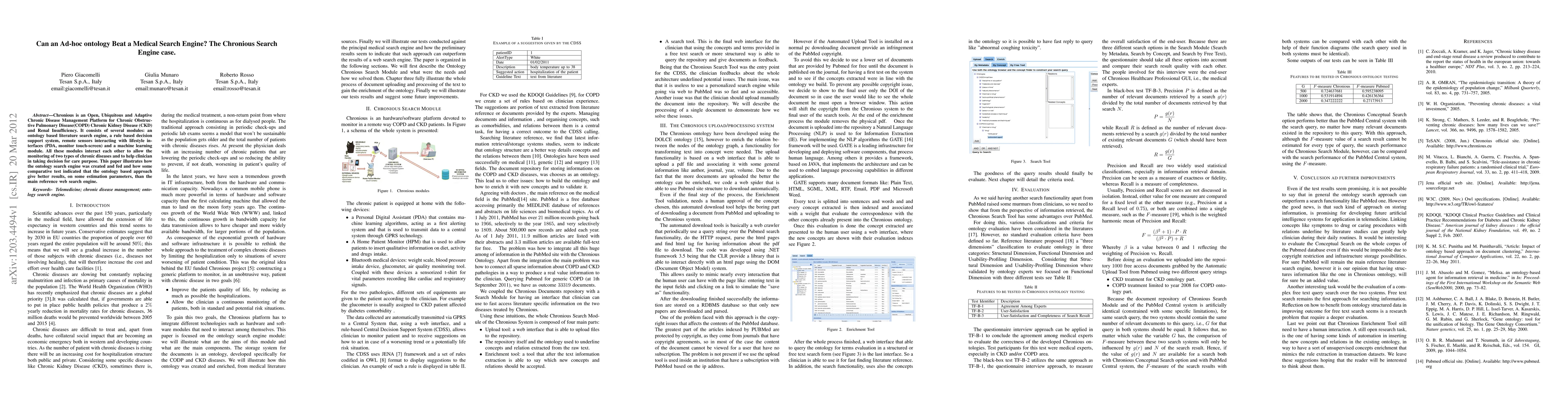 This paper explores the effectiveness of an ad-hoc ontology-based search engine within the Chronious platform for chronic disease management, demonstrating that it outperforms a mainstream web search engine in certain evaluation metrics. The study highlights the potential of tailored ontologies in specialized medical search contexts.