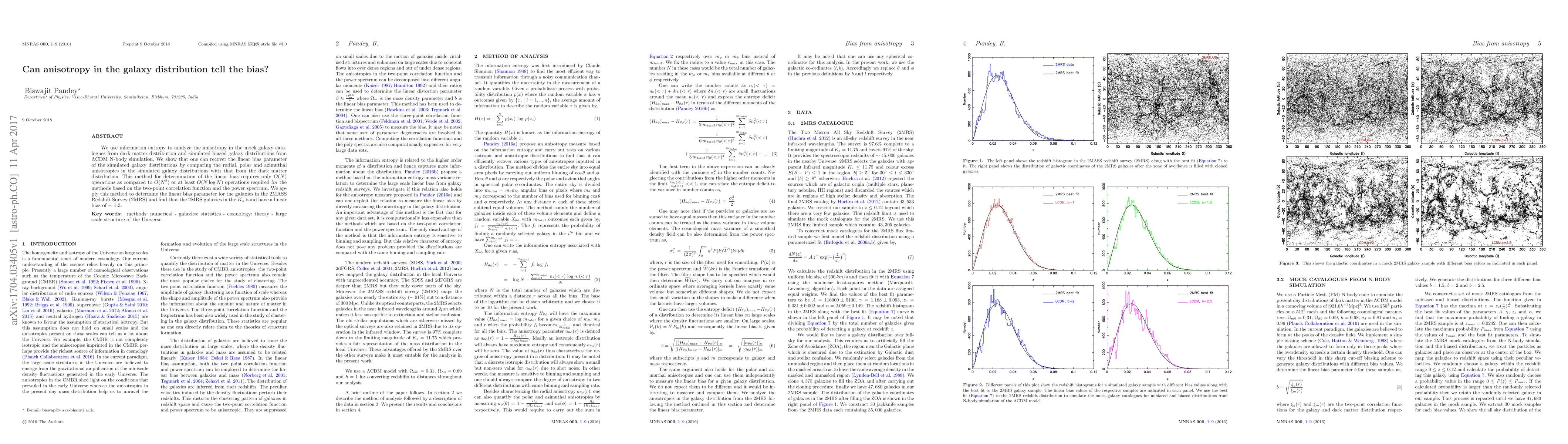 We use information entropy to analyze the anisotropy in the mock galaxy catalogues from dark matter distribution and simulated biased galaxy distributions from $\Lambda$CDM N-body simulation. We show that one can recover the linear bias parameter of the simulated galaxy distributions by comparing the radial, polar and azimuthal anisotropies in the simulated galaxy distributions with that from the dark matter distribution. This method for determination of the linear bias requires only $O(N)$ operations as compared to $O(N^{2})$ or at least $O(N \log N)$ operations required for the methods based on the two-point correlation function and the power spectrum. We apply this method to determine the linear bias parameter for the galaxies in the 2MASS Redshift Survey (2MRS) and find that the 2MRS galaxies in the $K_{s}$ band have a linear bias of $\sim 1.3$.