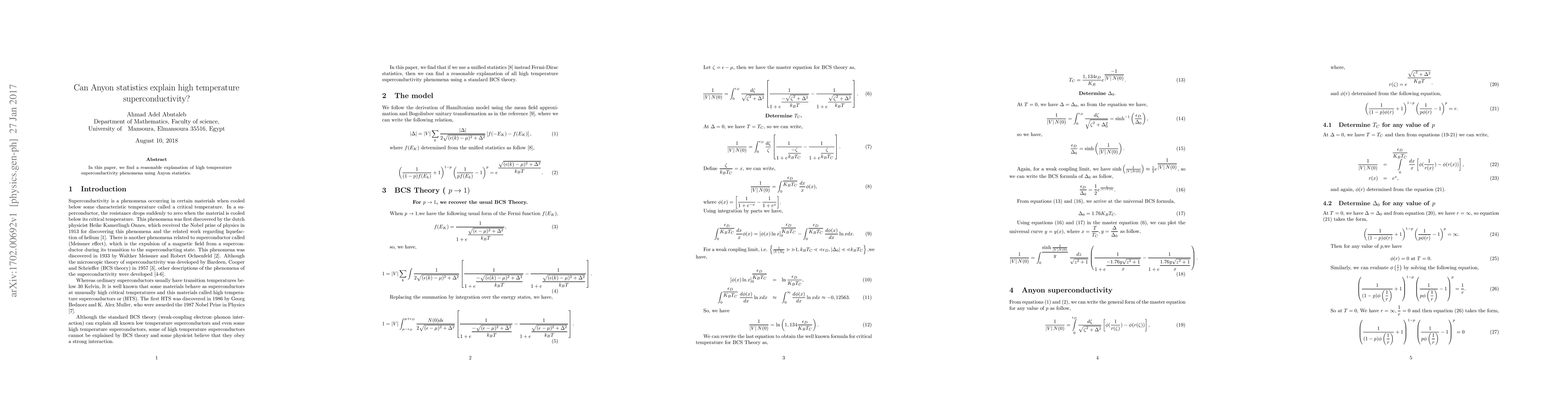 Summary: This paper proposes that high temperature superconductivity can be explained through the statistical behavior of anyons, suggesting a novel approach to understanding this complex phenomenon. The findings indicate a potential new framework for interpreting superconductivity at elevated temperatures.