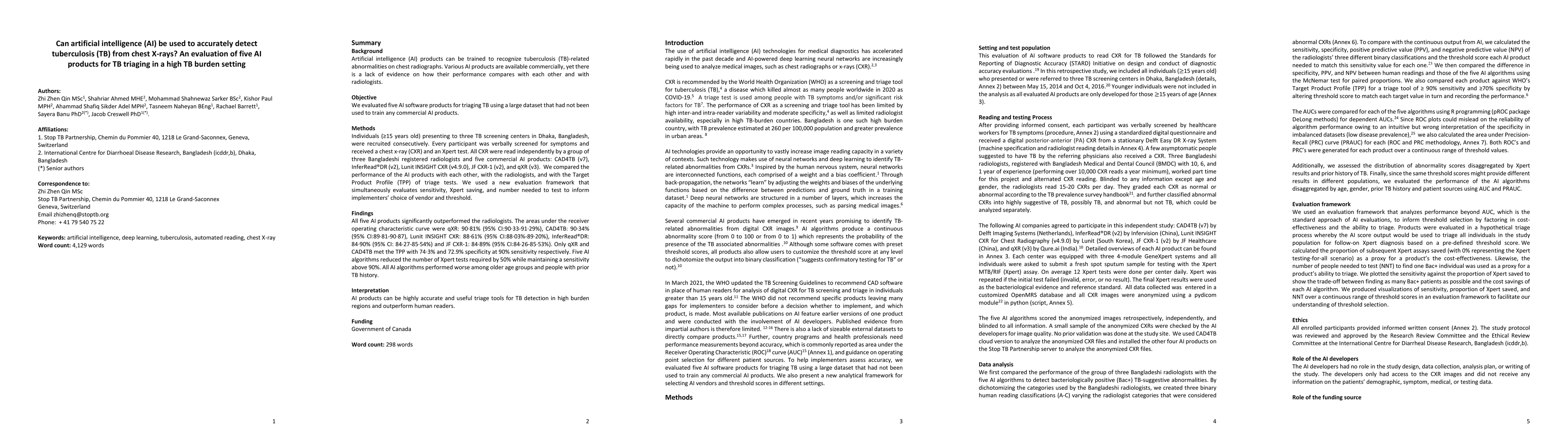 Artificial intelligence (AI) products can be trained to recognize tuberculosis (TB)-related abnormalities on chest radiographs. Various AI products are available commercially, yet there is lack of evidence on how their performance compared with each other and with radiologists. We evaluated five AI software products for screening and triaging TB using a large dataset that had not been used to train any commercial AI products. Individuals (>=15 years old) presenting to three TB screening centers in Dhaka, Bangladesh, were recruited consecutively. All CXR were read independently by a group of three Bangladeshi registered radiologists and five commercial AI products: CAD4TB (v7), InferReadDR (v2), Lunit INSIGHT CXR (v4.9.0), JF CXR-1 (v2), and qXR (v3). All five AI products significantly outperformed the Bangladeshi radiologists. The areas under the receiver operating characteristic curve are qXR: 90.81% (95% CI:90.33-91.29%), CAD4TB: 90.34% (95% CI:89.81-90.87), Lunit INSIGHT CXR: 88.61% (95% CI:88.03%-89.20%), InferReadDR: 84.90% (95% CI: 84.27-85.54%) and JF CXR-1: 84.89% (95% CI:84.26-85.53%). Only qXR met the TPP with 74.3% specificity at 90% sensitivity. Five AI algorithms can reduce the number of Xpert tests required by 50%, while maintaining a sensitivity above 90%. All AI algorithms performed worse among the older age and people with prior TB history. AI products can be highly accurate and useful screening and triage tools for TB detection in high burden regions and outperform human readers.