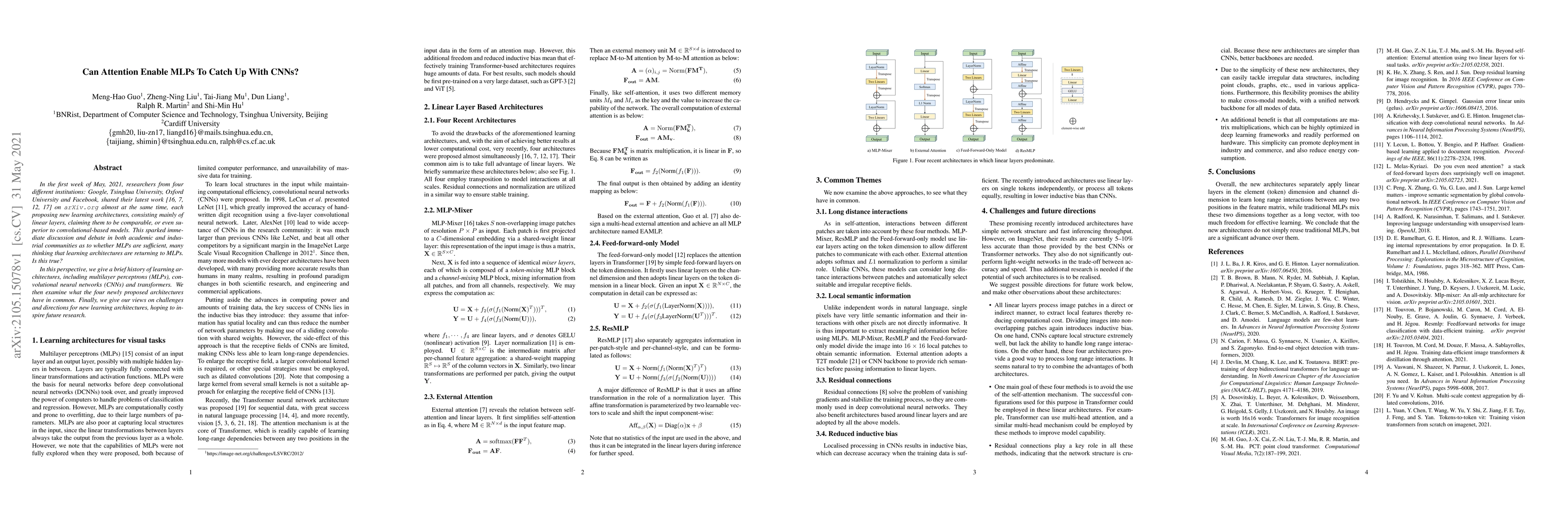 In the first week of May, 2021, researchers from four different institutions: Google, Tsinghua University, Oxford University and Facebook, shared their latest work [16, 7, 12, 17] on arXiv.org almost at the same time, each proposing new learning architectures, consisting mainly of linear layers, claiming them to be comparable, or even superior to convolutional-based models. This sparked immediate discussion and debate in both academic and industrial communities as to whether MLPs are sufficient, many thinking that learning architectures are returning to MLPs. Is this true? In this perspective, we give a brief history of learning architectures, including multilayer perceptrons (MLPs), convolutional neural networks (CNNs) and transformers. We then examine what the four newly proposed architectures have in common. Finally, we give our views on challenges and directions for new learning architectures, hoping to inspire future research.
