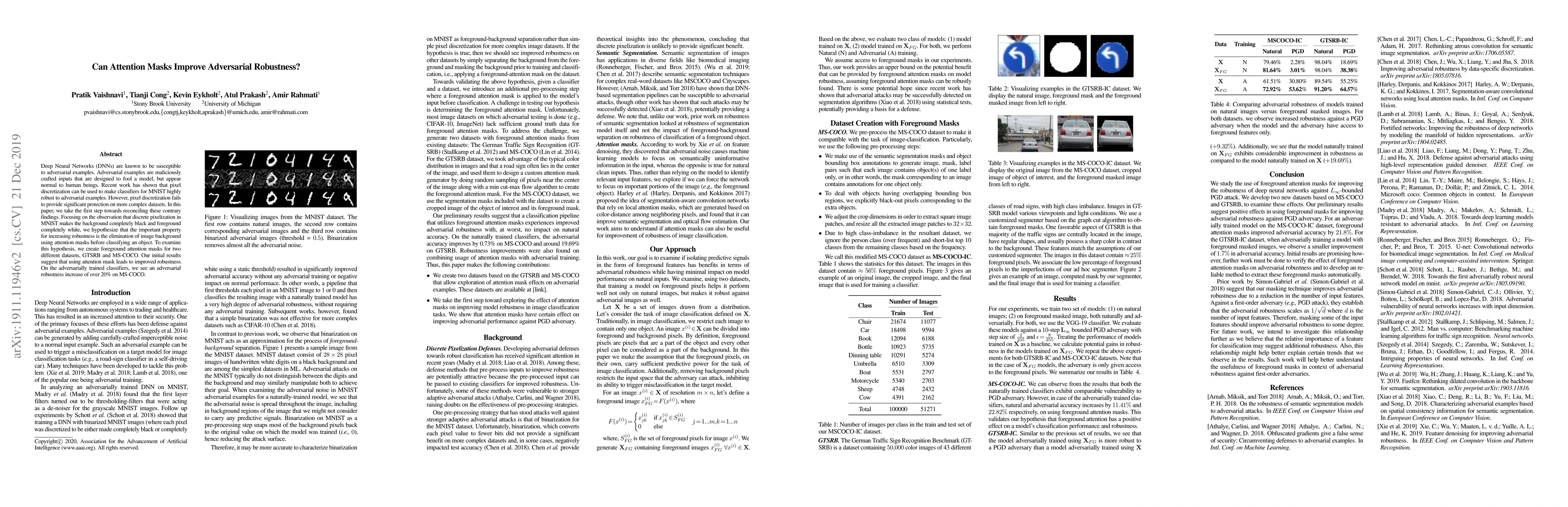 Deep Neural Networks (DNNs) are known to be susceptible to adversarial examples. Adversarial examples are maliciously crafted inputs that are designed to fool a model, but appear normal to human beings. Recent work has shown that pixel discretization can be used to make classifiers for MNIST highly robust to adversarial examples. However, pixel discretization fails to provide significant protection on more complex datasets. In this paper, we take the first step towards reconciling these contrary findings. Focusing on the observation that discrete pixelization in MNIST makes the background completely black and foreground completely white, we hypothesize that the important property for increasing robustness is the elimination of image background using attention masks before classifying an object. To examine this hypothesis, we create foreground attention masks for two different datasets, GTSRB and MS-COCO. Our initial results suggest that using attention mask leads to improved robustness. On the adversarially trained classifiers, we see an adversarial robustness increase of over 20% on MS-COCO.