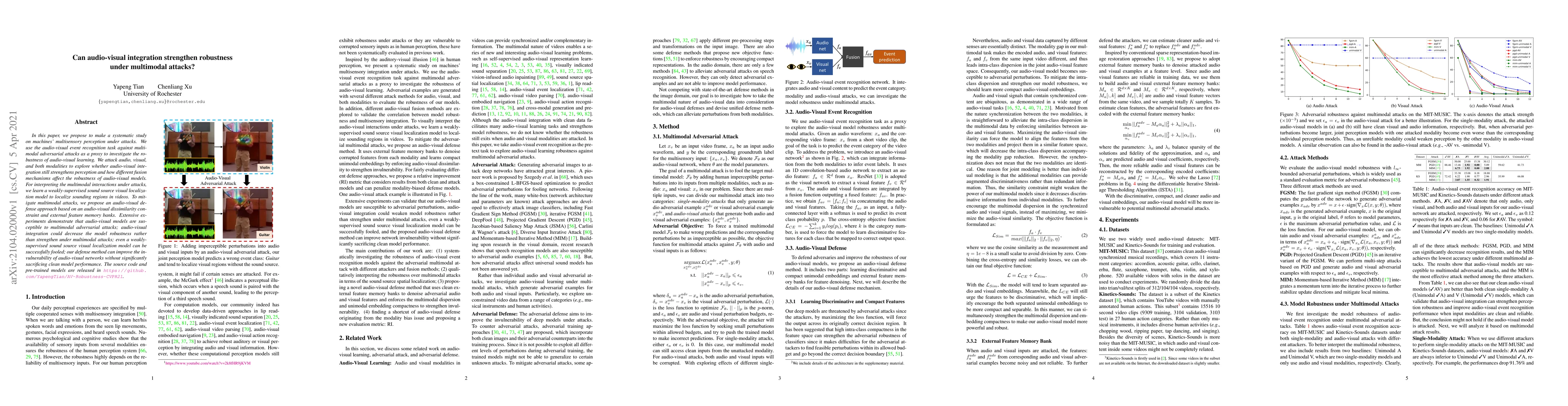 This paper investigates the robustness of audio-visual integration under multimodal adversarial attacks, finding that it may actually decrease model robustness. The authors propose a defense method based on an audio-visual dissimilarity constraint and external feature memory banks, which improves model invulnerability without significant loss of clean performance.