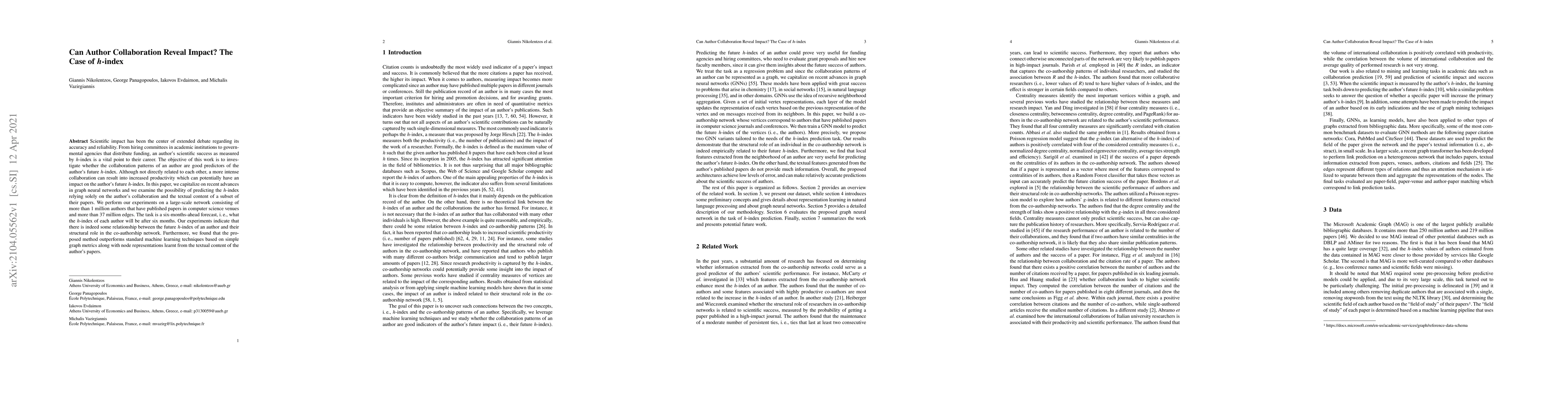 Scientific impact has been the center of extended debate regarding its accuracy and reliability. From hiring committees in academic institutions to governmental agencies that distribute funding, an author's scientific success as measured by the h-index is a vital point to their career. The objective of this work is to investigate whether the collaboration patterns of an author are good predictors of the author's future $h$-index. Although not directly related to each other, a more intense collaboration can result into increased productivity which can potentially have an impact on the author's future $h$-index. In this paper, we capitalize on recent advances in graph neural networks and we examine the possibility of predicting the $h$-index relying solely on the author's collaboration and the textual content of a subset of their papers. We perform our experiments on a large-scale network consisting of more than $1$ million authors that have published papers in computer science venues and more than $37$ million edges. The task is a six-months-ahead forecast, i.e. what the $h$-index of each author will be after six months. Our experiments indicate that there is indeed some relationship between the future $h$-index of an author and their structural role in the co-authorship network. Furthermore, we found that the proposed method outperforms standard machine learning techniques based on simple graph metrics along with node representations learned from the textual content of the author's papers.