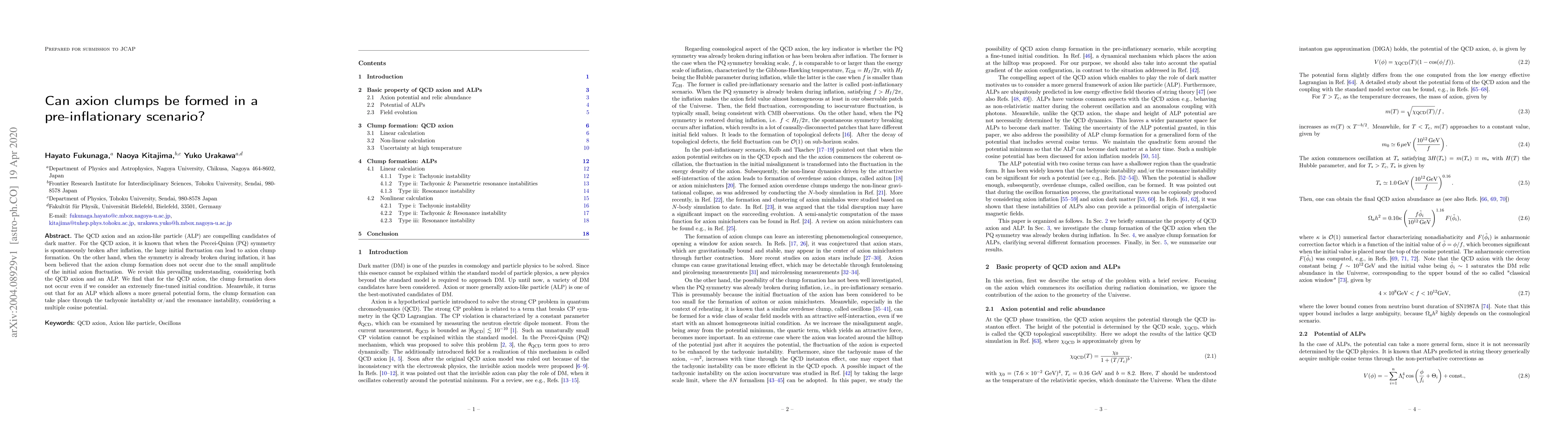 The QCD axion and an axion-like particle (ALP) are compelling candidates of dark matter. For the QCD axion, it is known that when the Peccei-Quinn (PQ) symmetry is spontaneously broken after inflation, the large initial fluctuation can lead to axion clump formation. On the other hand, when the symmetry is already broken during inflation, it has been believed that the axion clump formation does not occur due to the small amplitude of the initial axion fluctuation. We revisit this prevailing understanding, considering both the QCD axion and an ALP. We find that for the QCD axion, the clump formation does not occur even if we consider an extremely fine-tuned initial condition. Meanwhile, it turns out that for an ALP which allows a more general potential form, the clump formation can take place through the tachyonic instability or/and the resonance instability, considering a multiple cosine potential.
