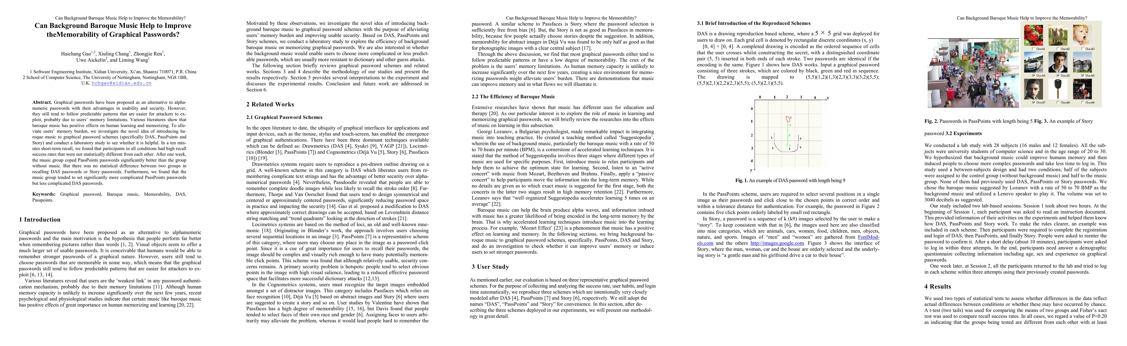 Graphical passwords have been proposed as an alternative to alphanumeric passwords with their advantages in usability and security. However, they still tend to follow predictable patterns that are easier for attackers to exploit, probably due to users' memory limitations. Various literatures show that baroque music has positive effects on human learning and memorizing. To alleviate users' memory burden, we investigate the novel idea of introducing baroque music to graphical password schemes (specifically DAS, PassPoints and Story) and conduct a laboratory study to see whether it is helpful. In a ten minutes short-term recall, we found that participants in all conditions had high recall success rates that were not statistically different from each other. After one week, the music group coped PassPoints passwords significantly better than the group without music. But there was no statistical difference between two groups in recalling DAS passwords or Story passwords. Further more, we found that the music group tended to set significantly more complicated PassPoints passwords but less complicated DAS passwords.