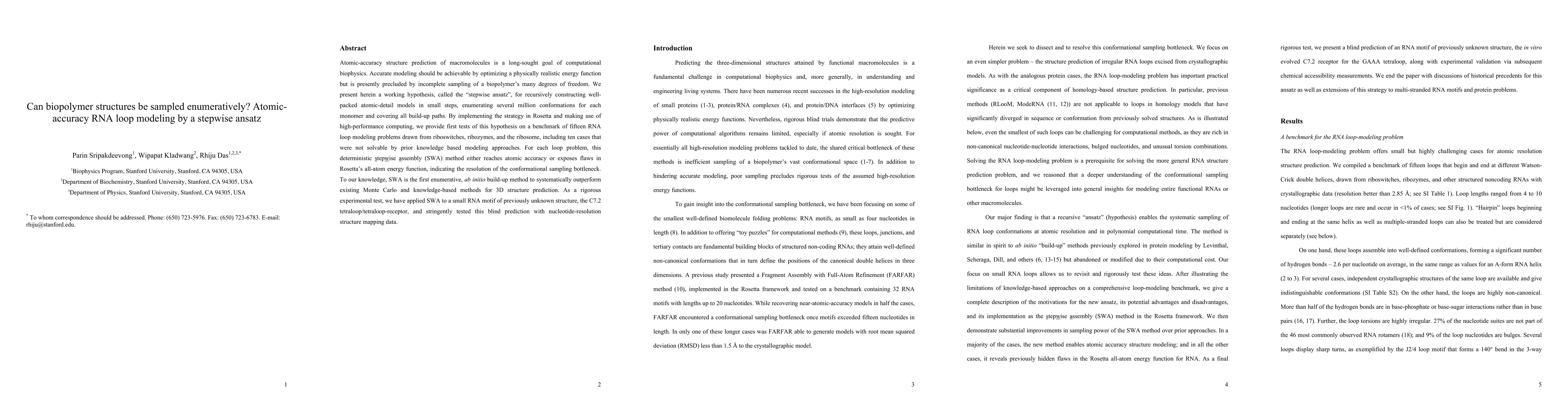 This paper proposes a "stepwise ansatz" method for enumeratively constructing atomic-accuracy RNA loop models, demonstrating its effectiveness in solving fifteen RNA loop problems, including ten previously unsolvable cases. The method, implemented in Rosetta, shows promise in overcoming the conformational sampling bottleneck in biopolymer structure prediction.