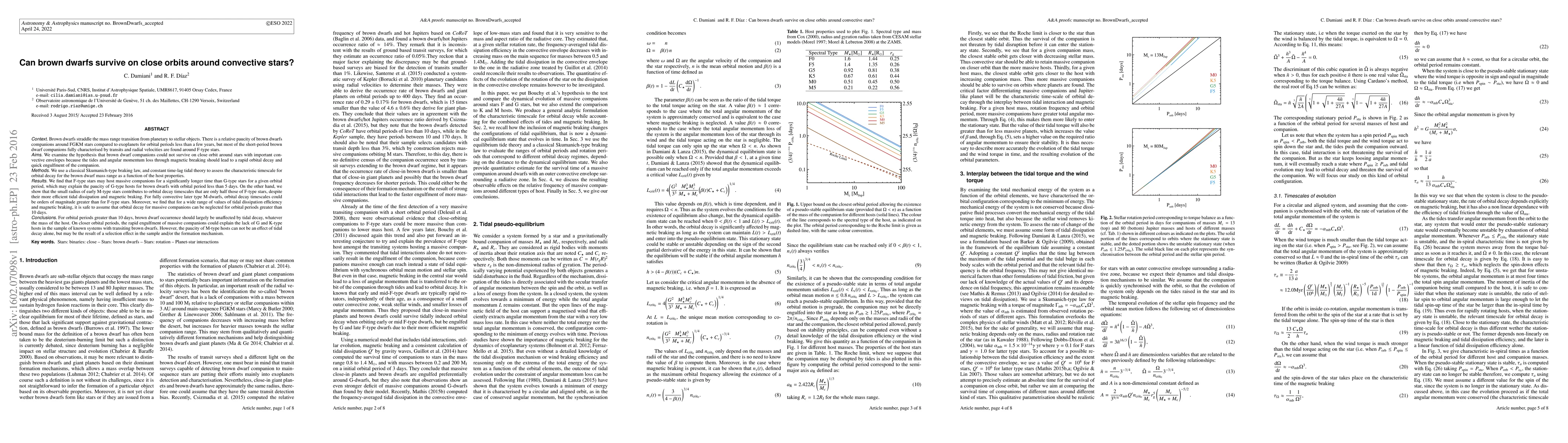 This paper investigates whether brown dwarfs can survive on close orbits around convective stars, finding that F-type stars can host massive companions longer than G-type stars due to slower orbital decay, while M-type stars show varied decay rates influenced by their small radii and tidal dissipation. The study suggests tidal decay explains the lack of G-type hosts but not M-type hosts, pointing to selection effects or formation mechanisms as possible reasons.