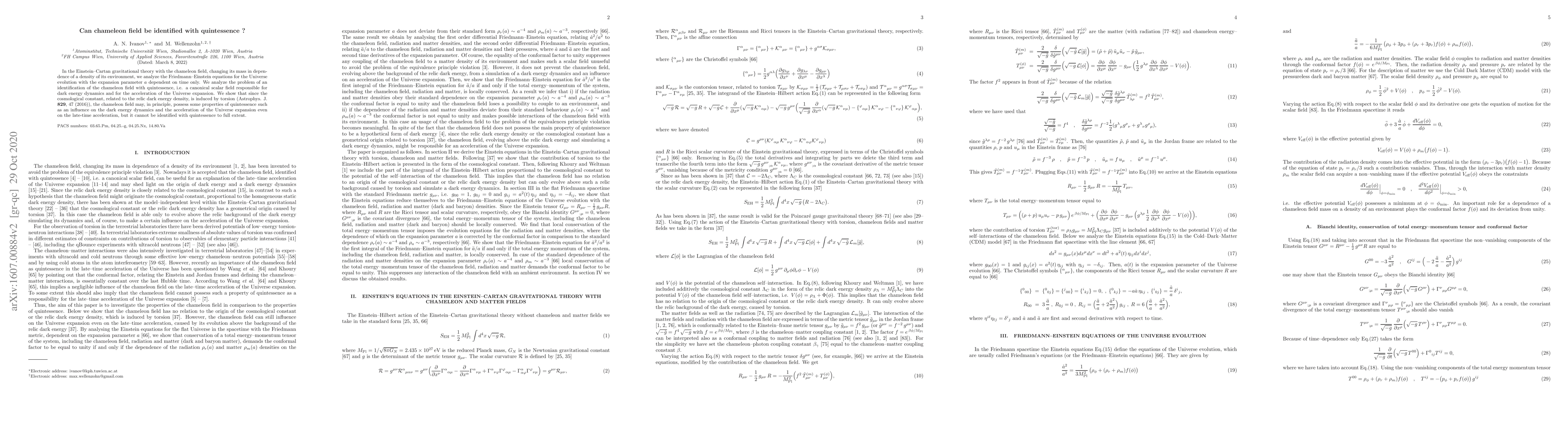 This paper investigates the potential identification of the chameleon field within Einstein-Cartan gravitational theory with quintessence, a canonical scalar field driving dark energy. While the chameleon field can influence dark energy dynamics and late-time cosmic acceleration, it cannot fully be identified with quintessence due to differences in their origins and properties.