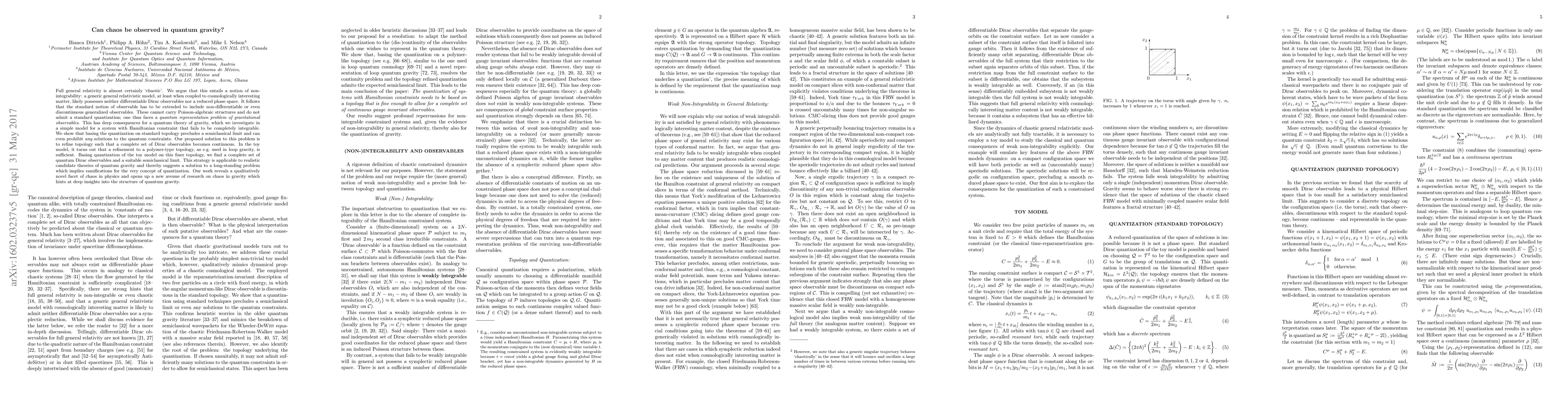 Full general relativity is almost certainly 'chaotic'. We argue that this entails a notion of nonintegrability: a generic general relativistic model, at least when coupled to cosmologically interesting matter, likely possesses neither differentiable Dirac observables nor a reduced phase space. It follows that the standard notion of observable has to be extended to include non-differentiable or even discontinuous generalized observables. These cannot carry Poisson-algebraic structures and do not admit a standard quantization; one thus faces a quantum representation problem of gravitational observables. This has deep consequences for a quantum theory of gravity, which we investigate in a simple model for a system with Hamiltonian constraint that fails to be completely integrable. We show that basing the quantization on standard topology precludes a semiclassical limit and can even prohibit any solutions to the quantum constraints. Our proposed solution to this problem is to refine topology such that a complete set of Dirac observables becomes continuous. In the toy model, it turns out that a refinement to a polymer-type topology, as e.g. used in loop gravity, is sufficient. Basing quantization of the toy model on this finer topology, we find a complete set of quantum Dirac observables and a suitable semiclassical limit. This strategy is applicable to realistic candidate theories of quantum gravity and thereby suggests a solution to a long-standing problem which implies ramifications for the very concept of quantization. Our work reveals a qualitatively novel facet of chaos in physics and opens up a new avenue of research on chaos in gravity which hints at deep insights into the structure of quantum gravity.