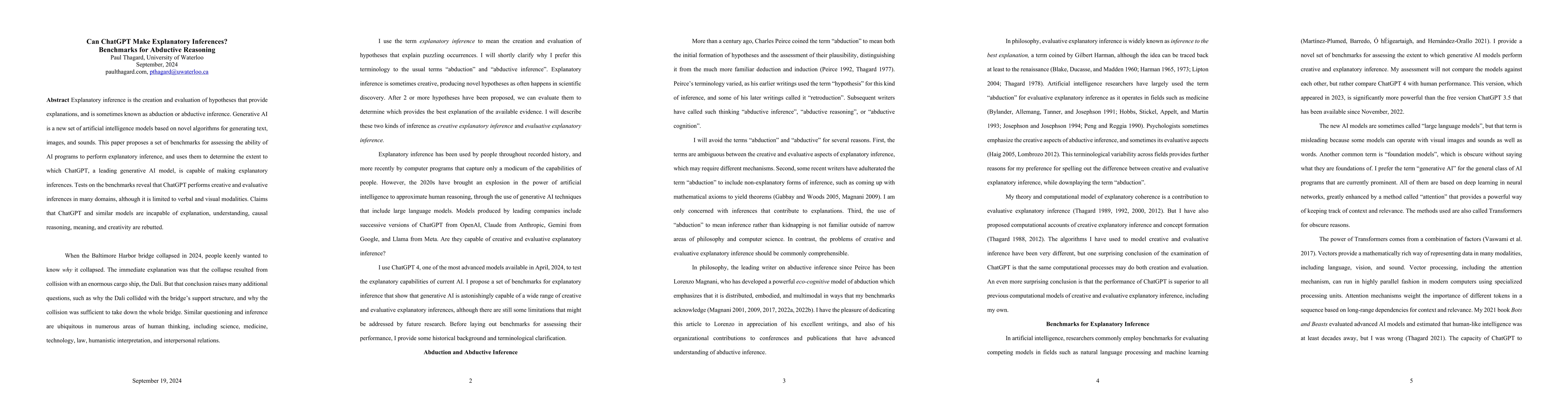 Explanatory inference is the creation and evaluation of hypotheses that provide explanations, and is sometimes known as abduction or abductive inference. Generative AI is a new set of artificial intelligence models based on novel algorithms for generating text, images, and sounds. This paper proposes a set of benchmarks for assessing the ability of AI programs to perform explanatory inference, and uses them to determine the extent to which ChatGPT, a leading generative AI model, is capable of making explanatory inferences. Tests on the benchmarks reveal that ChatGPT performs creative and evaluative inferences in many domains, although it is limited to verbal and visual modalities. Claims that ChatGPT and similar models are incapable of explanation, understanding, causal reasoning, meaning, and creativity are rebutted.