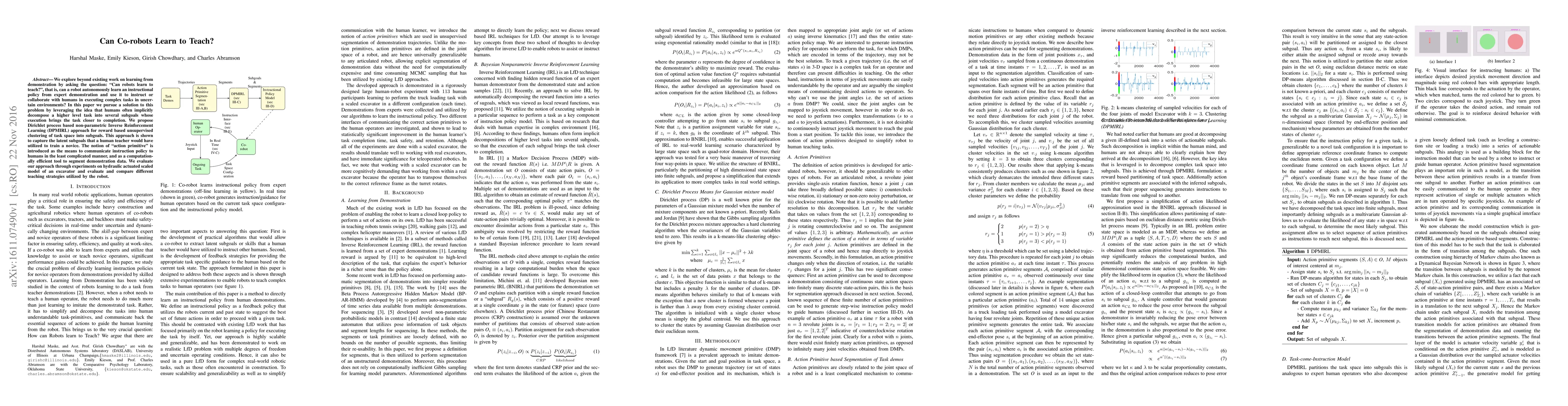 This paper investigates whether robots can autonomously learn to teach by decomposing complex tasks into subgoals using a DPMIRL approach. The study evaluates the effectiveness of this method through experiments on a scaled excavator model, demonstrating the robot's ability to instruct humans in task execution.
